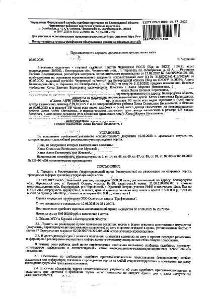 Название: Земельный участок площадью 1500 кв. м, КН: 31:08:1503002:87. Имущество обременено: арест, запрещение регистрации, ипотека (АО «БИК»). Взыскатель: Хатка Е.Б. Залог переходит на нового собственника. Имущество принадлежит на праве собственности Хатка М.Н. Основание реализации: решение Чернянского районного суда Белгородской области от 28.11.2024 № 2-428/2024 Канал: Госземля Белгородская область Область: обл Белгородская Чернянский район Район: п. Красный Остров Населенный пункт: участок №66 Локация: Смотреть на карте ВРИ: Для индивидуального жилищного строительства Кадастровый номер: 31:08:1503002:87 Кадастровая стоимость: 79290.00 Вид сделки: Продажа Площадь: 1500 м² Начальная цена: 646000.00 руб. Дата завершения: 02.09.2025 Подробнее: ГИС ТОРГИ #госземля #земляотгосударства #земля #земельныйучасток #земельныеторги #торги #аукцион #продажаземли #продажа #белгородскаяобласть