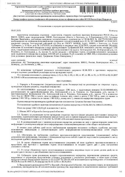 Название: Земельный участок площадью 1595 кв. м, КН: 31:15:0904008:404. Имущество обременено: арест, запрещение регистрации, ипотека (АО «БИК»). Взыскатель: АО «БИК». Имущество принадлежит на праве собственности Трофимовой И.В. Основание реализации: исполнительный лист Белгородского районного суда Белгородской области ФС № 046194087 от 30.04.2025 Канал: Госземля Белгородская область Область: обл Белгородская Белгородский район Район: п. Разумное Населенный пункт: ул. Прохладная, д. 2а, массив 71 Локация: Смотреть на карте ВРИ: Для индивидуального жилищного строительства Кадастровый номер: 31:15:0904008:404 Кадастровая стоимость: 1240591.00 Вид сделки: Продажа Площадь: 1595 м² Начальная цена: 1061520.00 руб. Дата завершения: 02.09.2025 Подробнее: ГИС ТОРГИ #госземля #земляотгосударства #земля #земельныйучасток #земельныеторги #торги #аукцион #продажаземли #продажа #белгородскаяобласть