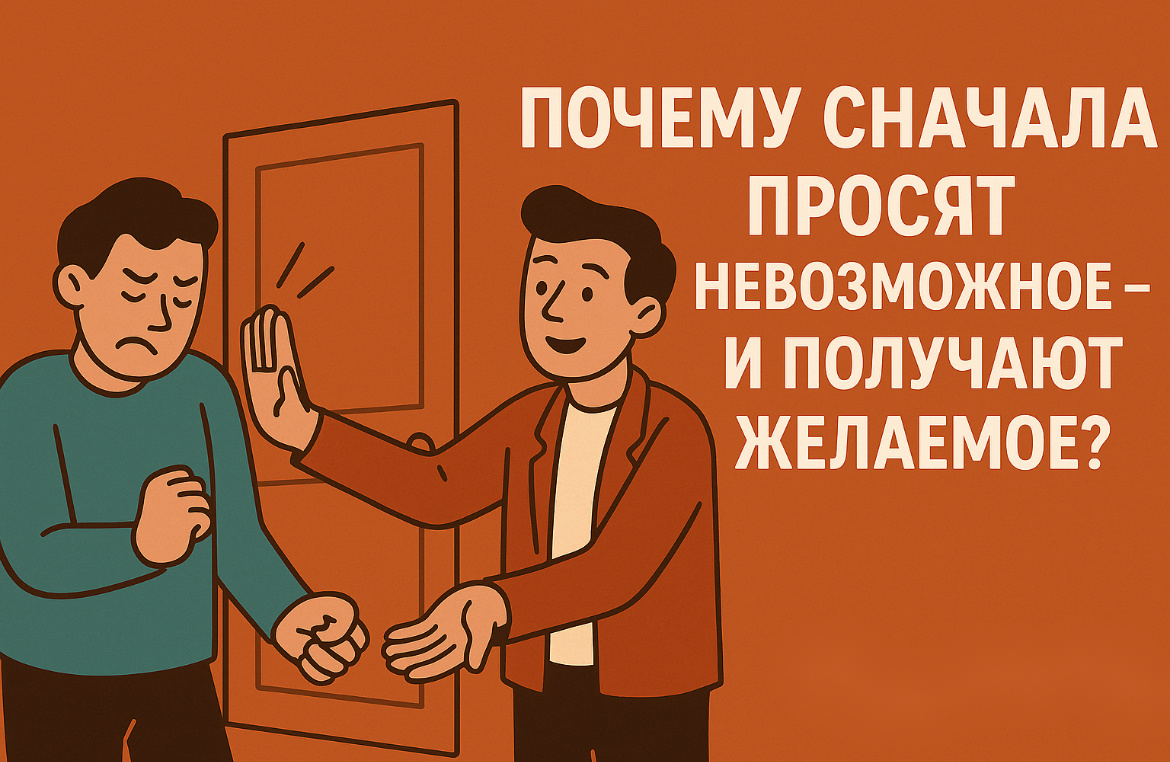 Когда тебя сначала просят о чём-то слишком большом, а потом — о чём-то скромном, ты чаще соглашаешься на второе. Хотя по сути — и это необязательно. Почему? Это называется "Дверь в лицо" (англ. door-in-the-face; DITF) — известной техникой убеждения. Сначала человеку предъявляют завышенную просьбу, на которую он почти наверняка скажет "нет". А затем, на контрасте, предлагают более реалистичную просьбу, и та уже кажется разумной. Психолог Роберт Чалдини и его коллеги провёли серию классических экспериментов, чтобы показать эффективность методики манипулирования "Дверь в лицо" в 1975 году. 💬 Участников (72-ух случайно проходящих студентов) сначала просили бесплатно (на волонтёрской основе) стать наставниками для несовершеннолетних преступников на последующие два года — почти все отказывались. Затем ту же группу просили просто сопроводить "трудных подростков" в зоопарк на один день. 📊 Результат: То есть само наличие "перебора" в начале резко (≈ в 3 раза) повышало согласие на второе, "ра