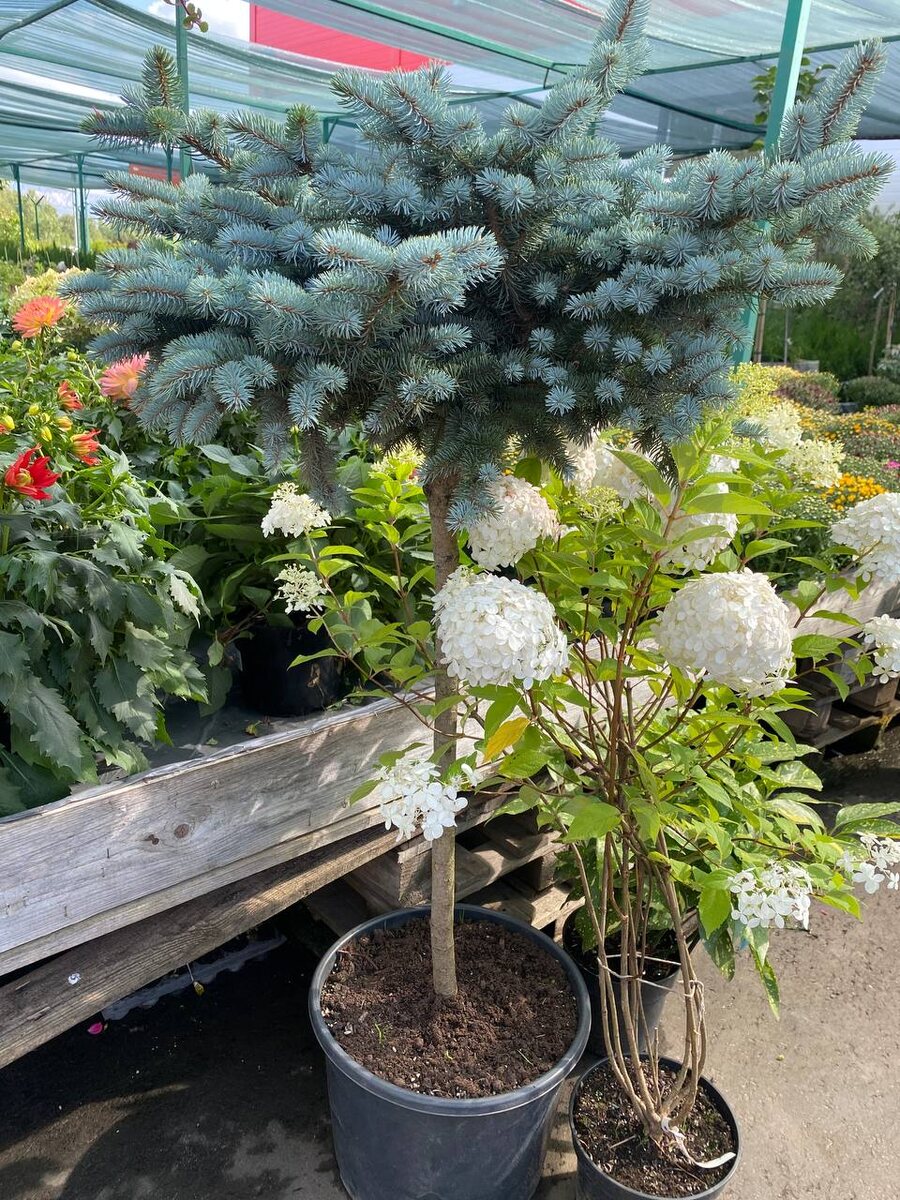 Гуляем по открытой площадке садового центра. Ель на штамбе вижу впервые, не понравилась. Она же ЕЛЬ ! Должно быть величие и красота ! Роза не плохо, но слишком высокий штамб. А вам как ? Нравятся растения на штамбе ?