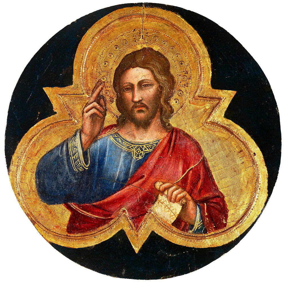 Панно с изображением благословляющего Христа может принадлежать к одному из полиптихов, написанных Спинелло в Лукке в начале 1380-х годов, возможно, к одному из двух алтарных произведений, заказанных оливецкими монахами-бенедиктинцами флорентийскому плотнику Симоне Чини, позолотчику из Сенезе Габриэлло Сарачини и художнику Спинелло Аретино.