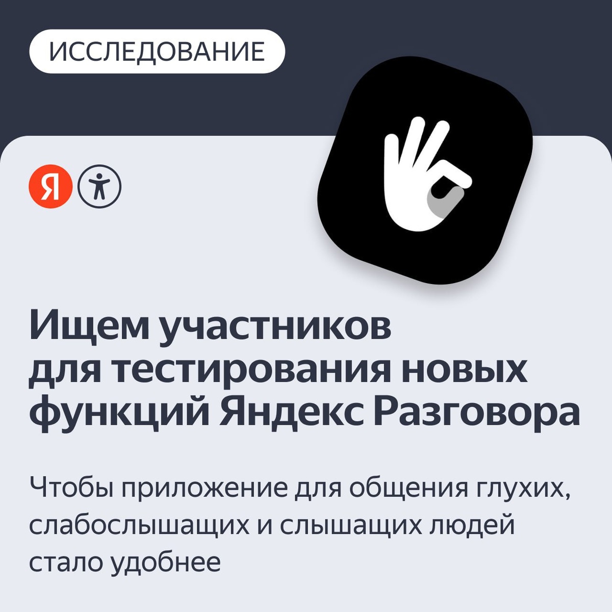 📠📨🗂📈🧏🙌 📙🎓😱🔮 🔜 Яндекс ищет участников в тестировании новых функций Разговора 📔 Мы работаем над улучшением Яндекс Разговора — приложения для преобразования устной речи в текст и обратно. Оно помогает глухим, слабослышащим и слышащим людям общаться без барьеров. Сейчас мы добавляем новые функции — и нам важно узнать ваше мнение. ✅ Кто нам подходит? Люди с особенностями слуха, которые пользуются Яндекс Разговором или его аналогами. Либо те, кто готов опробовать приложение впервые и поделиться впечатлениями. Если хотите участвовать в тесте, пожалуйста, заполните анкету на Яндекс Формах → Перевод всех вопросов анкеты на РЖЯ доступен в видео на Диске. Всё анонимно и конфиденциальное, а за участие предусмотрена благодарность. ✨ Пожалуйста, поделитесь этим постом с теми, кто может нам помочь сделать Разговор удобнее для каждого. 💬🔊📩🔖 Инклюзия в Яндексе Эти и другие новости - на @gluxixnet.