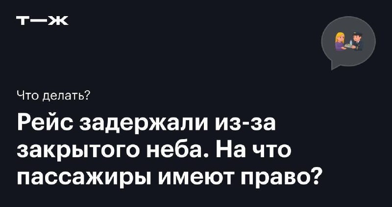 Если рейс задержали более чем на два часа, пассажирам положены прохладительные напитки. После четвертого часа — горячее питание. Затем кормят каждые шесть часов днем и каждые восемь часов — ночью. При задержке более восьми часов днем или более шести часов ночью — бесплатный номер в гостинице и трансфер из аэропорта и обратно. ⌛ Рассказали, как вернуть деньги за билет, если вылет перенесли, и можно ли получить компенсацию за задержку рейса: https://t-j.ru/ch-tg/nebo-zakrito/