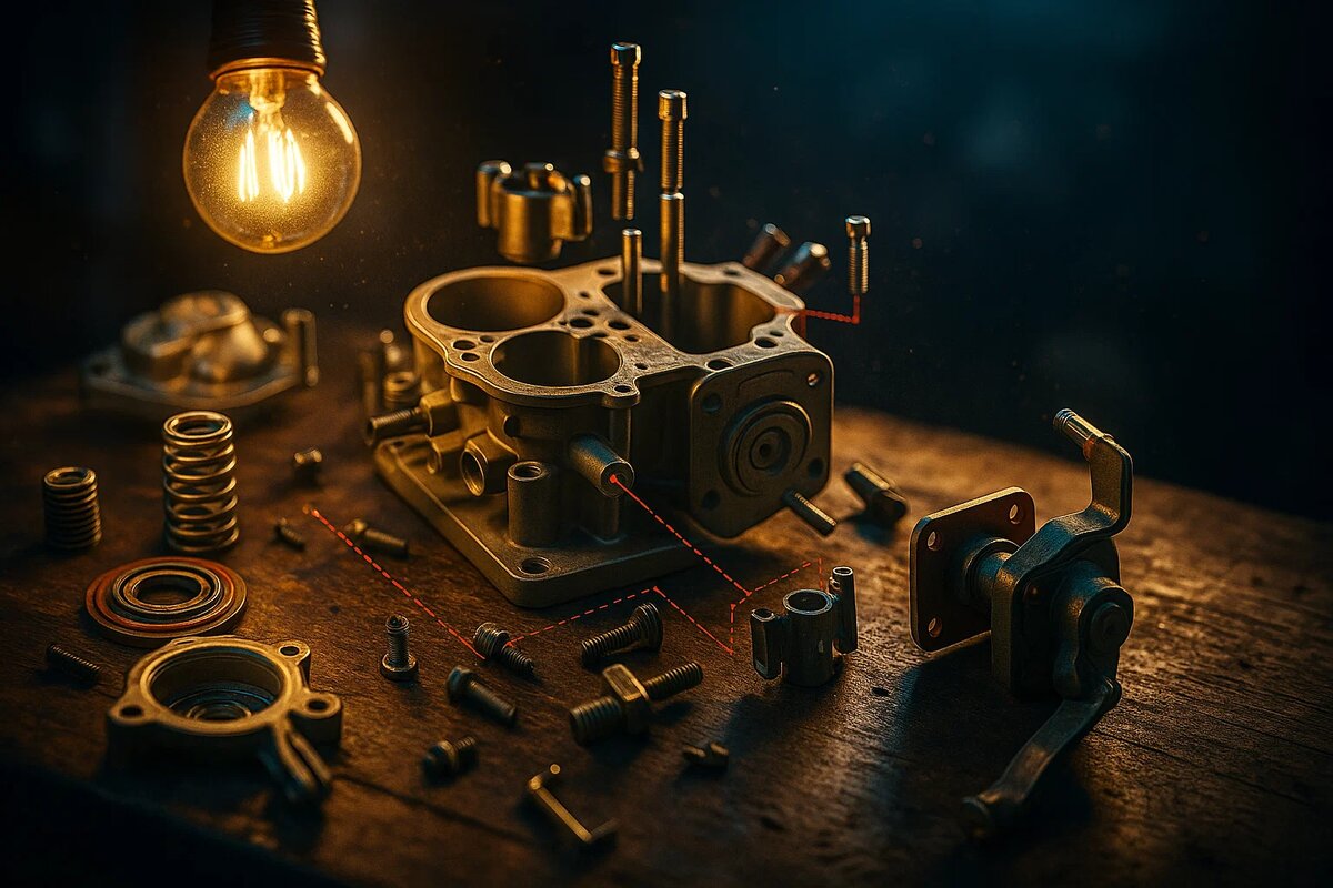 Многие молодые автолюбители сегодня видели карбюратор разве что на картинках или в старых фильмах. Но если вы решили оживить старенькую «ласточку» или только-только купили первую машину за небольшие деньги, нужно понимать: именно карбюратор - тот самый «повар», который готовит правильную топливно-воздушную смесь для двигателя. Карбюратор смешивает бензин с воздухом и подаёт эту смесь в цилиндры. Без него двигатель просто не заработает. Принцип простой: воздух проходит через диффузоры, топливо дозируется жиклёрами, и в итоге мотор получает то, что нужно для работы в любых режимах - от холодного пуска до максимальной скорости. Утро, мотор остыл, и вы тянете за тросик - это закрывает воздушную заслонку и немного приоткрывает дроссель. Так смесь становится «богаче» - больше бензина, меньше воздуха. Только так холодный двигатель заводится без капризов. Завели - потихоньку убираете подсос, заслонка открывается, обороты падают, мотор прогревается. Когда машина прогрелась и стоит на нейтралке
