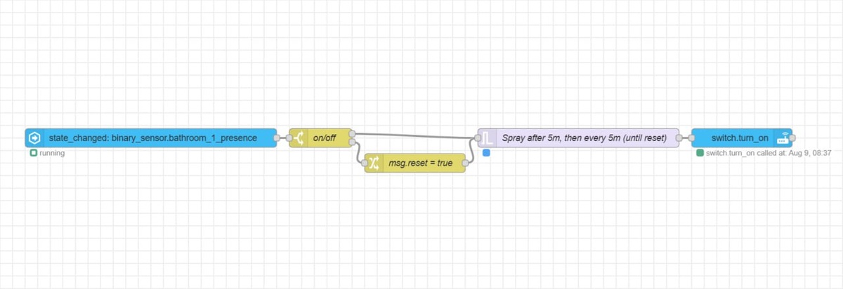 В ответ на пост Желаю всем прекрасных выходных 🌤 Приобрёл я тут у @iqharu два освежителя и по этому поводу выкладываю новую #автоматизацию💡: - Распыление освежителя каждые 5 минут 💨, пока человек находится в туалете (по датчику присутствия) Например, за 13 минут пребывания — 2 распыления: на 5-й и 10-й минутах 🚽 Ссылка: https://pastebin.com/En8HDSe8 Реклама Королёва Е.В. ИНН: 381608208557 Урок. Установка, Компаньон, Автоматизация Node Red в Home Assistant Урок. Импорт (копирование) чужих автоматизаций Node Red в Home Assistant #Автоматизация #NodeRed #AirWick #локально #wifi