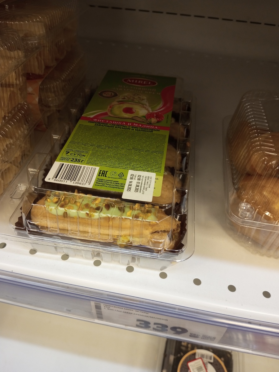 Настроение такое, что хочется начать с пирожных. Вот нигде больше не нашла эти эклеры от "Mirel", но они настолько вкусные, что предпочитаю побыстрее проходить мимо холодильника, покупая их как можно реже. Ранее были от этого же бренда с соленой карамелью (само тесто эклеров при этом шоколадное), так я их хвалила, считая, что лучше и не придумать, а тут появился вкус малина-фисташка. Тонкое тесто, много крема, причем он воздушный и не химозный по вкусу, просто шик.