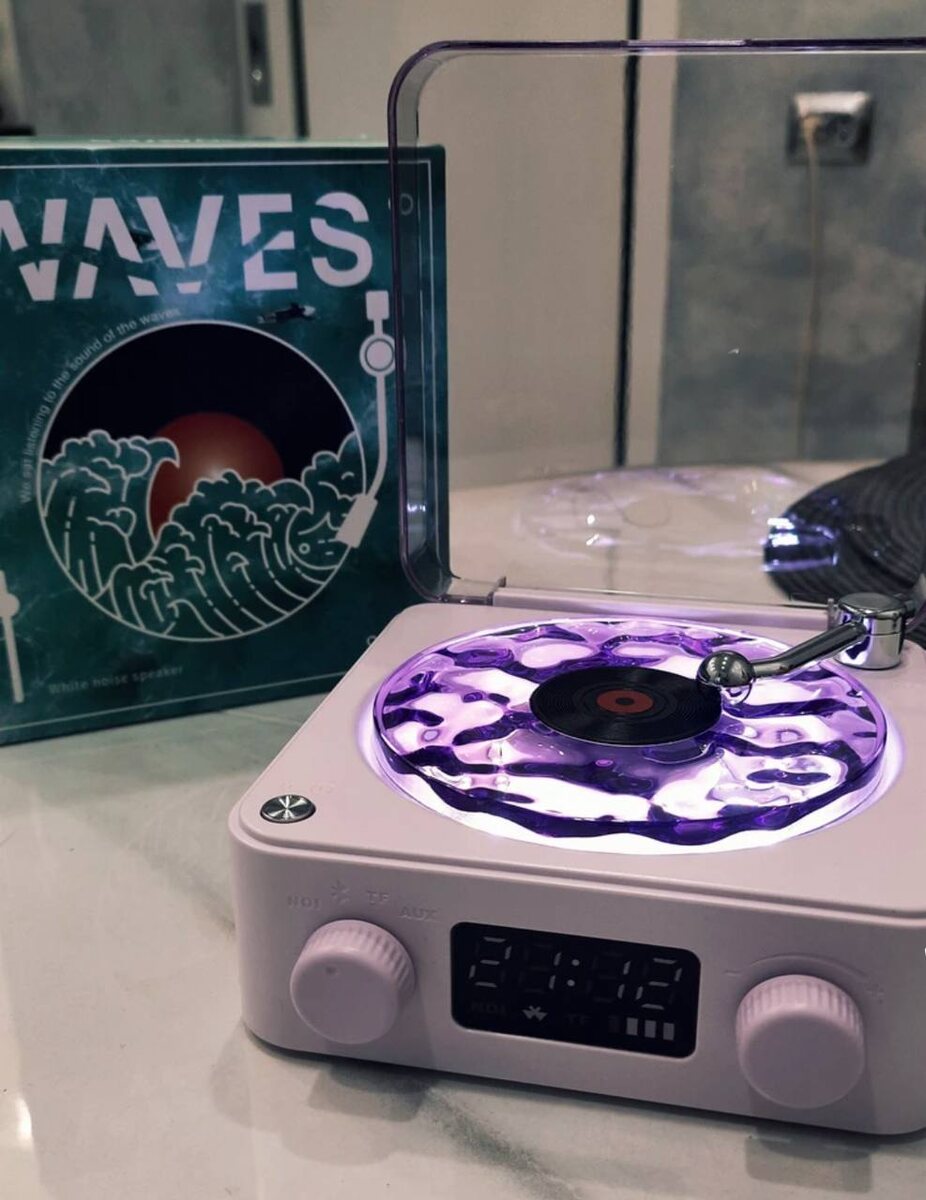 Необычная колонка, которая выглядит как виниловый проигрыватель. Такая колонка выполняет функцию часов и ночника. Работает она от Bluetooth и aux.