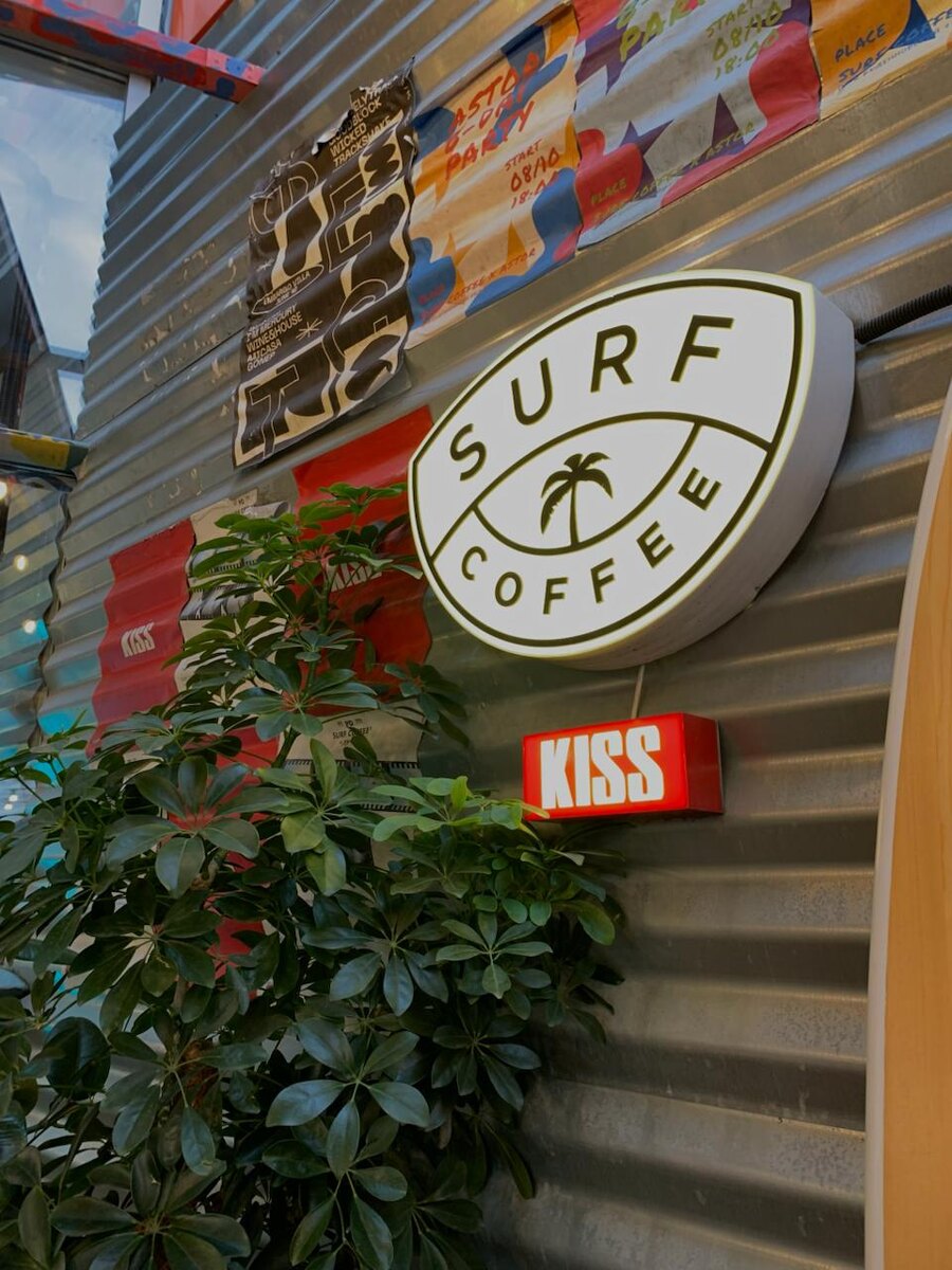Surf Coffee — не про кофе (но и про него тоже) В каком ещё месте ты можешь почувствовать себя серфером, не снимая пуховик? Surf Coffee — это не просто кофеенки с пальмами и досками на стене, а мини-культура побега: от серости, рутины, скучного латте без вкуса и смысла. Каждый спот Surf — как портал в идеальное утро: чуть прохладный воздух, музыка, будто из калифорнийского плейлиста, и стаканы с классными дизайнами. В этом всё и дело — ты как бы зашёл за кофе, а вышел уже немного свободнее, потому что они умудрились упаковать в бумажный стакан ощущение жизни на расслабоне. За последние три года сеть выросла с 120 до 270 спотов по всей стране — и, похоже, на этом они останавливаться не собираются. ✌ И да, у них действительно классный кофе, но главное — вайб, ведь Surf — это бренд, который продал не напиток, а образ жизни, и в этом вся их гениальность: ты не просто покупаешь капучино, ты покупаешь момент, в котором хочется остаться подольше. А больше эстетики Surf Coffee — в этом бо