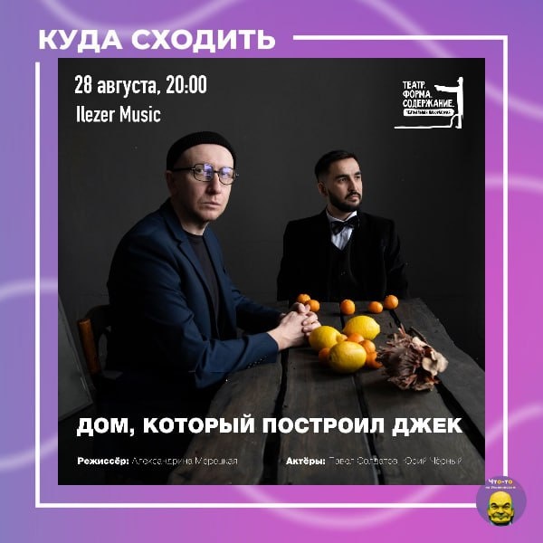 Показ спектакля 18+ «Дом, который построил Джек» от лаборатории Театр.Форма.Содержание История одного героя, маленького мальчика, его отца и не случившегося полёта. Если хотите открыть новый «театральный язык» и готовы пережить тот самый загадочный «катарсис», вам сюда! Режиссёр: Александрина Мерецкая Актеры: Павел Солдатов и Юрий Чёрный 📆 Когда: 28 августа, 20.00 📍Где: Ilezer Music (ул. Карла Маркса, 25) 💳 Цена и билеты: уточнять здесь #куда_пойти_ул