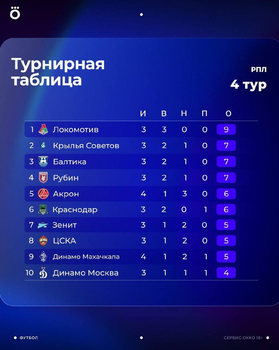«Локо» пока идет без осечек, а «Крылья» и «Балтика» — в топ-3. Интересно 😳