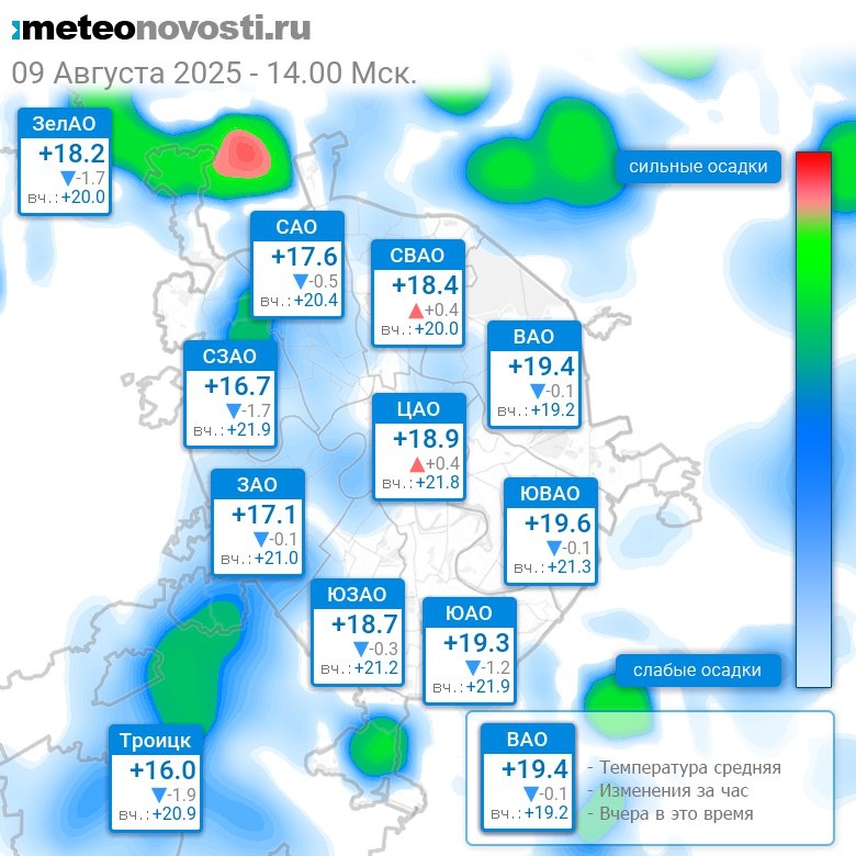 В 14:00 в Москве было от +15.4°C до +21.2°C, средняя температура +18.4°C #погода #Москва #лето #температура #9августа #суббота