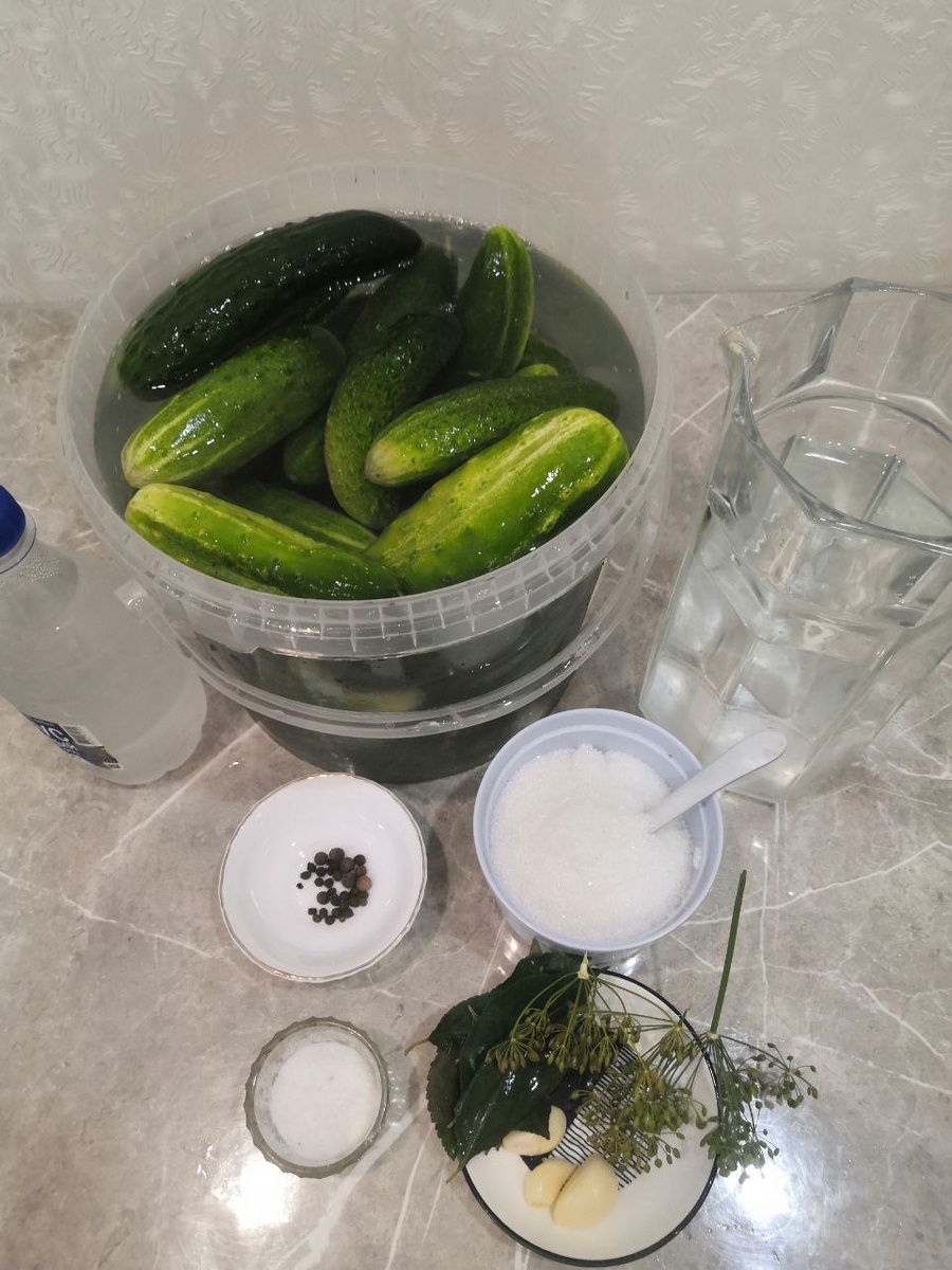 Маринованные огурцы по данному рецепту получаются хрустящими и очень вкусными. Маринованные огурцы можно подавать к столу в качестве самостоятельной закуски или же использовать для приготовления салатов. Для приготовления нам понадобятся; Рецепт на одну трёхлитровую банку. У меня 2 по 1,5 литра. На дно стерилизованной 1,5 литровой банки укладываем зубчик чеснока, зонтик укропа и пару листьев вишни. Укладываем огурцы и сверху кладём зубчик чеснока, зонтик укропа и пару вишнёвых листьев, половину всего перца (черный и душистый). То же самое проделываем со второй банкой. Воду доводим до кипения. Заливаем банки с огурцами и специями кипятком и даём настояться 10 минут. В кастрюлю кладём сахар. Добавляем соль. Выливаем жидкость из банки с огурцами. Кипятим 5 минут. Добавляем уксус. Заливаем маринад обратно в банки с огурцами. Винтовые крышки ошпариваем кипятком. Закрываем баки крышками. Приятного аппетита!