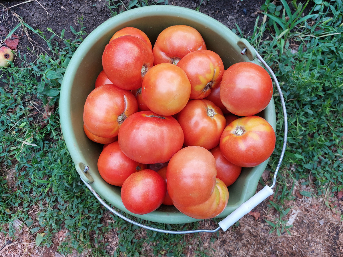 Вышла на огород. По традиции собрала ведро помидоров, чтобы было чем заниматься. К вечеру закрыла еще восемь литров томатного сока.