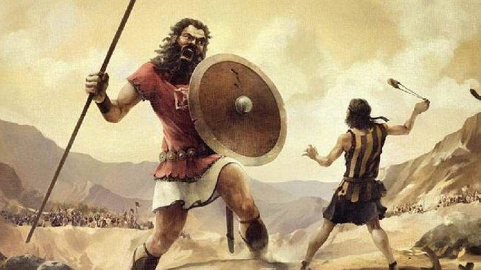 Перед поединком Давид тщательно выбрал пять гладких камней из ручья. Эти камни стали символом его решимости и веры. Когда он вышел на поле боя, Голиаф рассмеялся, увидев перед собой юного противника. Он осыпал его оскорблениями, называя себя посланником богов и обещая скормить юношу птицам и зверям.