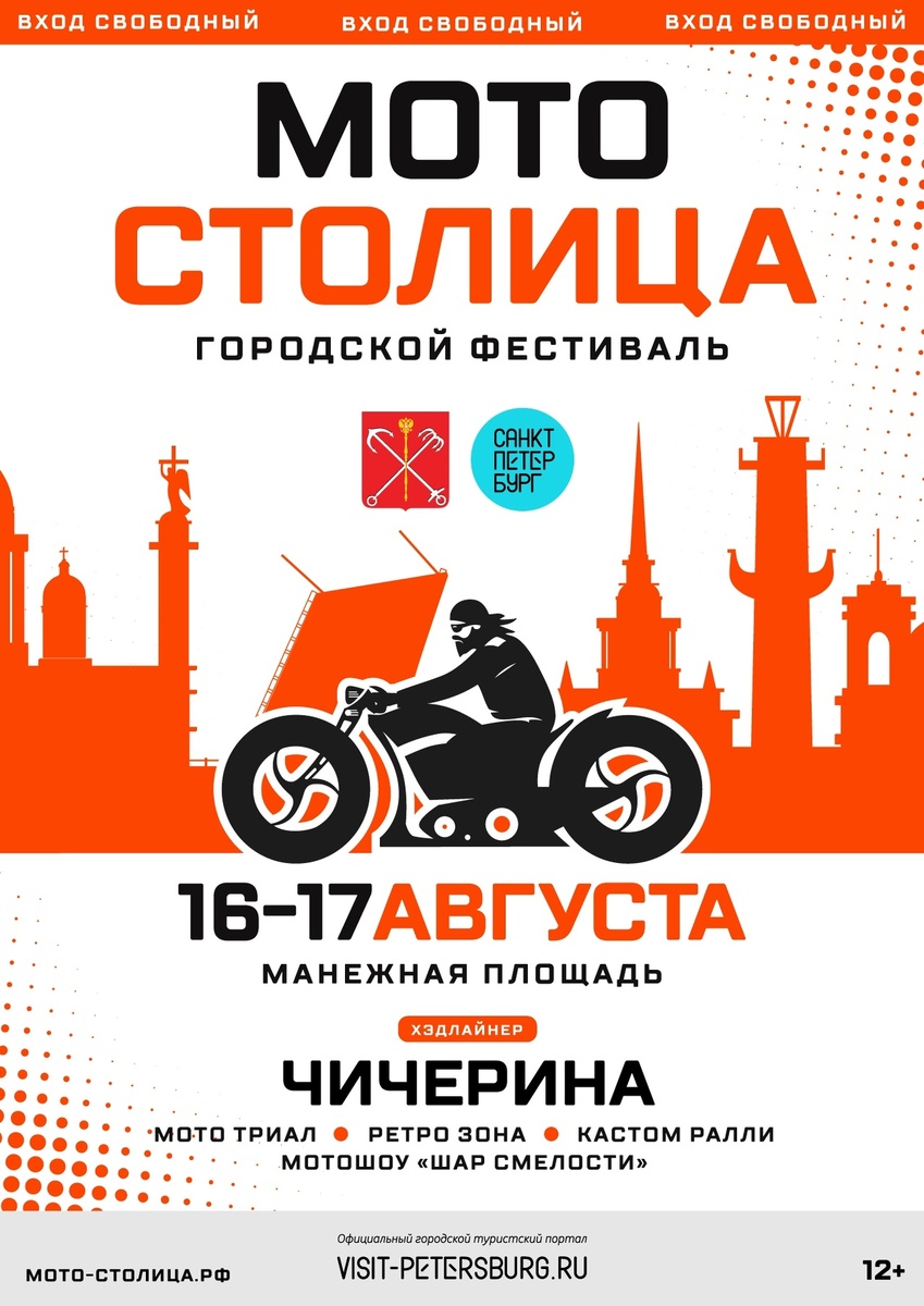 🔁 Дальняк.рф™: ПРОГРАММА ФЕСТИВАЛЯ «МОТОСТОЛИЦА» 2025 16 - 17 августа 2025 ✅16 августа, Суббота ГЛАВНАЯ СЦЕНА 12:00 – 22:00 работа всех площадок фестиваля 12:00 - начало работы основной сцены. 12:45 – Представление зоны «Мото ТРИАЛ» 13:10 – Представление «Шара смелости» 13:35 - Представление «Кастом-зоны» и Русской Сотки 14:00 - Торжественное открытие фестиваля. 14:30 – Представление Ретро мото-зоны 15:00- Старт мотоколонны 15:05 – Выступление музыкальной группы «Postfacktum» 16:15 – Представление детской площадки, детский флешмоб 16:25 - Выступление музыкальной группы «Thunder Voice» 17:25 - Брейк-данс шоу «Красавчики» 18:00 - Выступление музыкальной группы «ЛёничBand» 19:00 - Силовое шоу 19:20- Мотоклубы и СВО 20:00- Хедлайнер фестиваля «ЧИЧЕРИНА» 21:50 – Подведение итогов дня 22:00 - Окончание программы 1го дня фестиваля ЗОНА МОТО-ТРИАЛ 16.08 Суббота Выступления по расписанию ШАР СМЕЛОСТИ 16.08 Суббота Выступления по расписанию Целый день с 12:00 до 22:00 работают площадки: КА