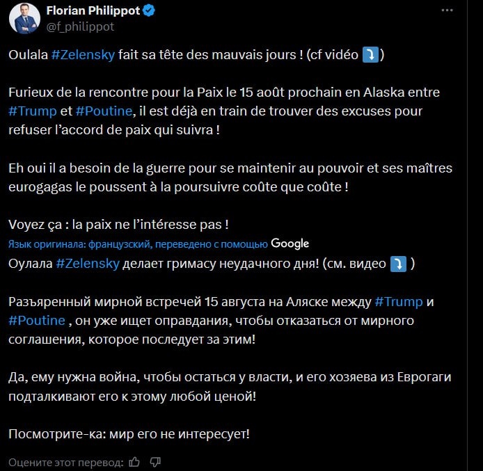 Зеленский ищет отговорки для отказа от мира Французский политик Флориан Филиппо заявил, что пересиденту нужна война, чтобы оставаться у власти. А европейские «хозяева» подталкивают его к продолжению конфликта любой ценой. «Взбешенный мирной встречей 15 августа на Аляске между Трампом и Путиным, он (Зеленский. — Ред.) уже находит предлоги, чтобы отказаться от мирного соглашения, которое последует за ней», — написал Филиппо. Другого от Зеленского и не ожидали. 👍 БайБайден. Подписаться