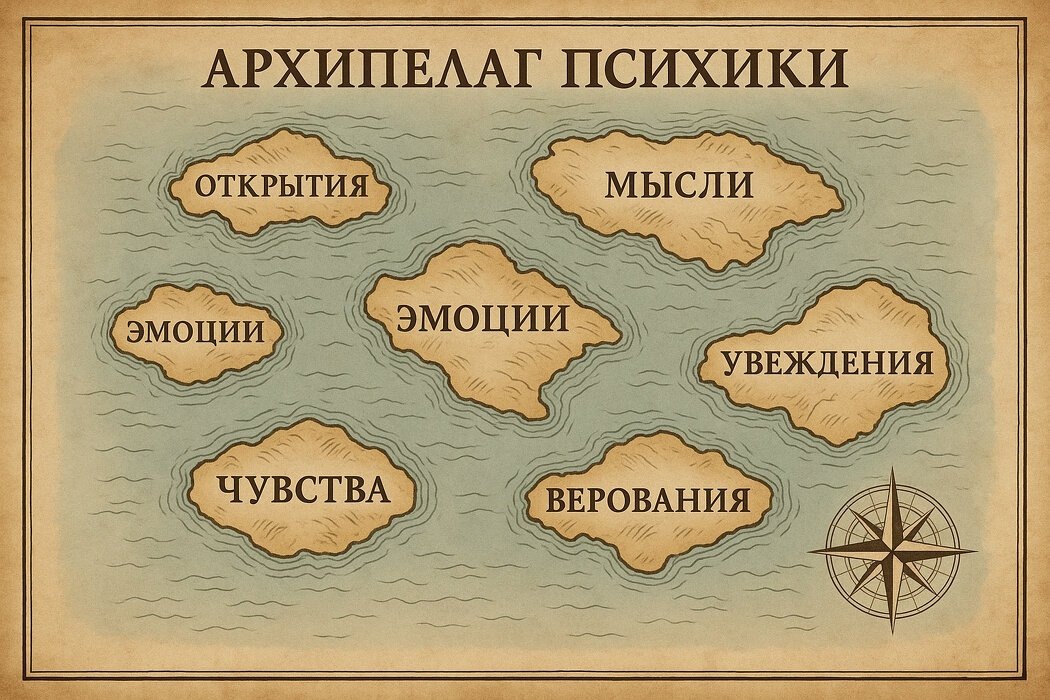Архипелаг «Психика». Это не просто "метафора для красивого сравнения", а удивительно точная модель внутреннего устройства человека. Представьте себе цепь островов, каждый из которых — часть вашего внутреннего мира: остров Эго, остров Интуиции, остров Воспоминаний, остров Грез, остров Сущности и множество крошечных рифов и скал, на которых иногда рождаются самые неожиданные мысли. Между ними течет общий океан — энергия мыслей, чувств и переживаний. Но живя на одном из островов, мы часто ведем себя так, словно других островов вовсе не существует. Мы обустраиваем свой «берег», строим стены, патрулируем границы и, если кто-то упомянет о дальних землях, пожимаем плечами: «Не верю». Такое «островное» мышление — наследие целых веков культурных и религиозных установок. Концепция «запятнанного грехами» подсознания, выросшая из догмы об «изначальном грехе», создала в людях иллюзию, будто внутри — враг. И вместе с этим почти исчезла идея души, как высшей, целостной и доброжелательной основы лично