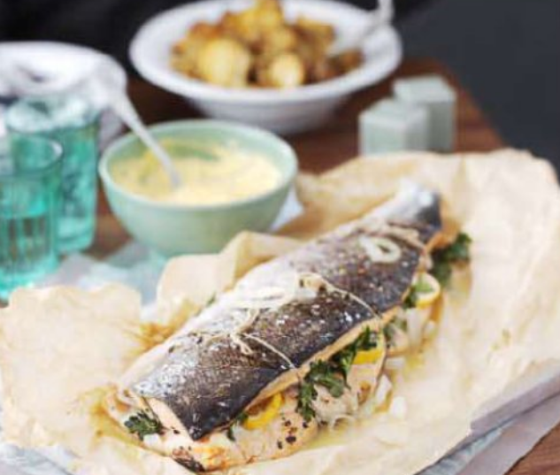 6 порций (в зависимости от веса филе; из 2 кг филе получается 6 порций) Разогрейте духовку до 200 градусов. Положите одно филе лосося чешуей вниз на большой кусок фольги. Посыпьте его ломтиками лимона, петрушкой, укропом и эстрагоном, нарезанными луковицами лука-шалот и приправами. Затем положите сверху второе филе чешуёй вверх. Свяжите эти два филе в 2х-3х местах ниткой, чтобы зафиксировать. Сбрызните белым вином и заверните фольгой, чтобы запечатать. Положите на противень и запекайте в течение 50 минут — 1 часа, пока лосось не приготовится. Чтобы проверить готовность, проткните филе ножом и убедитесь, что мясо легко рассыпается.