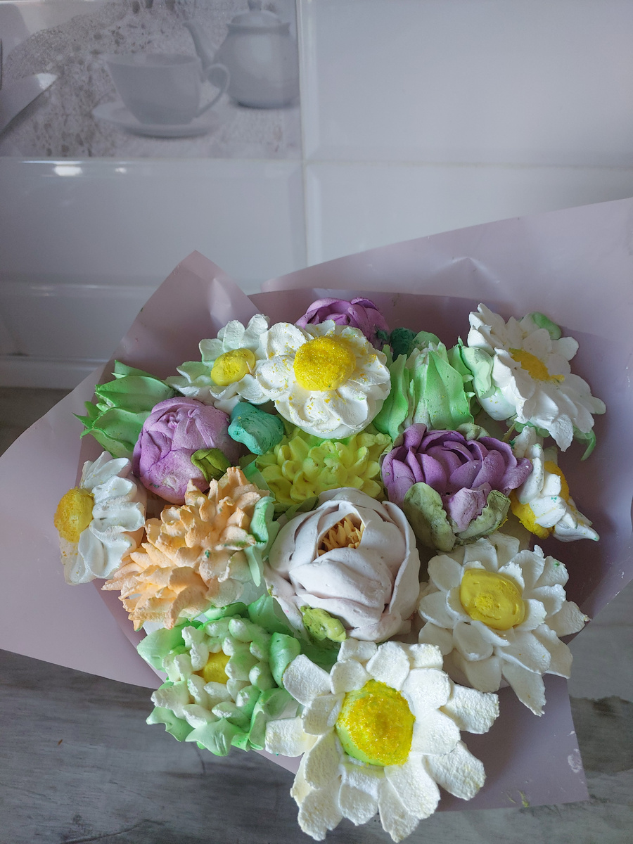 Здравствуйте дорогие друзья и гости моего канала! Спасибо большое за ваши пожелания и добрые слова❤️ Многим понравились мои зефирные букеты и пряники. Конечно нашлись и те кому не понравились. Я все прекрасно понимаю, как говорится на вкус все фломастеры разные. Я и сама вижу, что у меня не все идеально. Я торопыжка, мне хочется побыстрей приготовить и сфотографировать. Из- за этого у меня часто выходят ляпы. Вы не подумайте на заказ я стараюсь и делаю хорошо, как умею. А вот для своей фотосесии всегда спешу. Сегодня училась изготовлять зефирные ромашки. Мне казалось, что это очень легкий цветок, но знаете нет. У меня были трудности с лепестками. Я не могла найти подходящую насадку для отсадки лепестков и у меня не все получилось. Вот такие ромашки получились. Два часа они у меня простояли на стабилизации , а я все ходила вокруг цветов. Потом не выдержала и собрала букетик. Хорошо цветам было бы до завтра простоять и высохнуть, но у меня прям руки чесались. Мне очень хотел