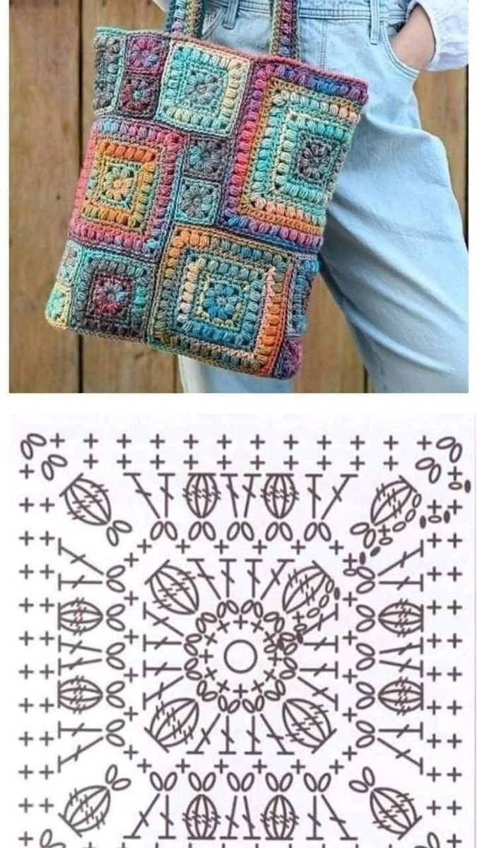 Понравилась сумка, ну и заодно решила разные раскладки квадратов показать. правда, квадраты там одного размера, а в сумке разного. Я думаю, более-менее опытные вязальщицы знают как это исправить😀.