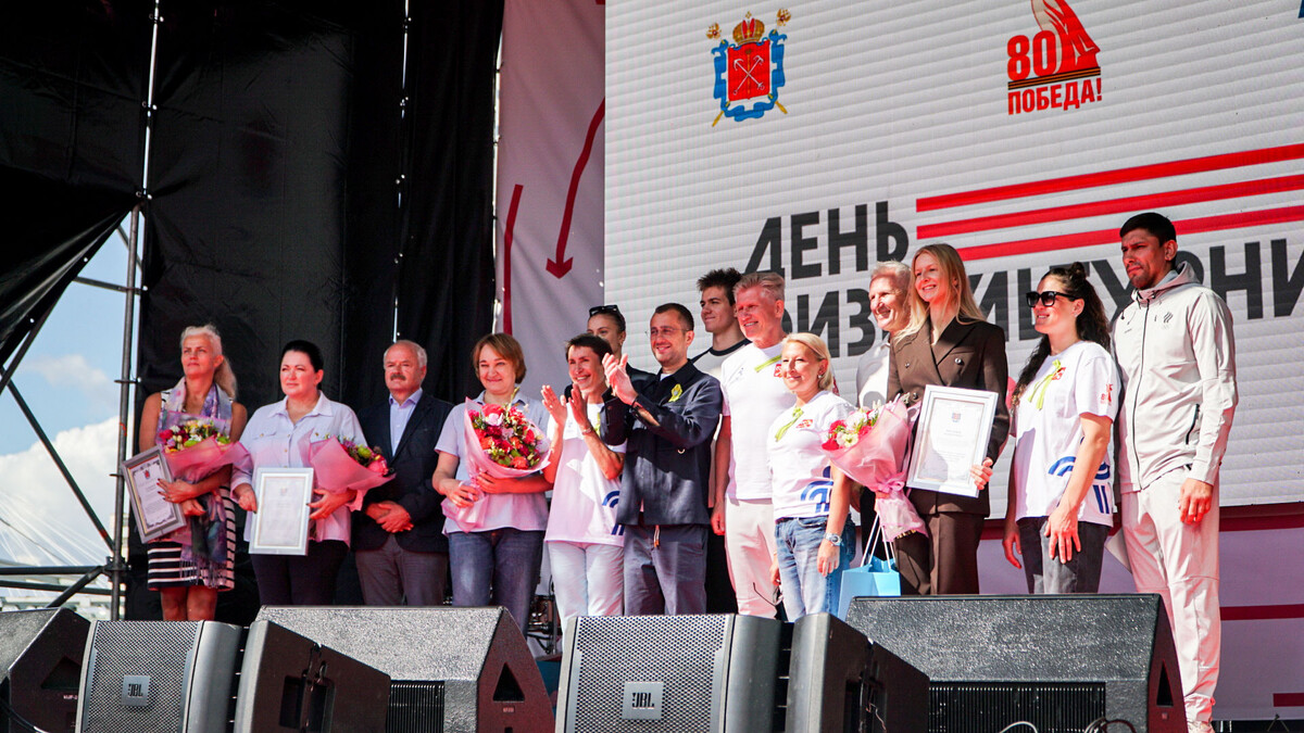 Более 4 тысяч человек прошли в парадном строю – представители всех районов города, ветераны СВО, спортсмены серебряного возраста. В колонне Комитета по физической культуре и спорту Санкт-Петербурга – олимпийские чемпионы Ленинграда – Петербурга Любовь Егорова, Дмитрий Васильев, Оксана Казакова, Юрий Кашкаров и Наталья Воробьева. На главной сцене праздника чествовали наших спортсменов – победителей и призеров чемпионата мира по водным видам спорта. Вице-губернатор Борис Пиотровский вручил благодарности губернатора Санкт-Петербурга Александра Беглова чемпионам мира по плаванию Александре Кузнецовой, Мирону Лифинцеву, серебряному призеру чемпионата Евгении Чикуновой, тренерам Ольге Байдаловой, Елене Кузнецовой, Михаилу Горелику (все – плавание) и Светлане Леонтьевской (прыжки в воду). Председатель Комитета по физической культуре и спорту, заслуженный мастер спорта России Антон Шантырь отметил благодарностями и почетными грамотами ведомства тренеров, инструкторов по спорту и специалистов о