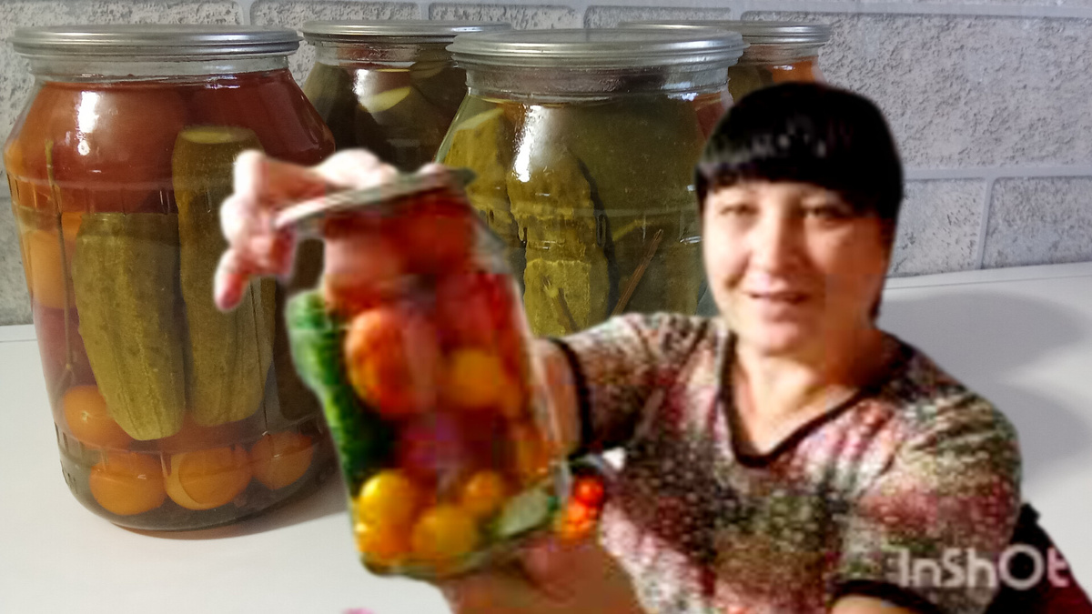 помидоры мелкие огурцы маленькие соль 1 ст.л без горки сахар 1 ст.л с хорошей горкой перец горошек 5 штук лавровый лист кусочек гвоздика 1 штука уксус (70% )-0,5 ч.л. огурцы и зелень хорошо помыть, замочить в холодной воде минимум на 3 часа помидоры достаточно просто помыть в нескольких водах банки хорошо помыть, затем банки простерилизовать, крышки прокипятить 2 минуты На дно банки кладём зонтик укропа, кусочек листа хрена, зубчик чеснока помидоры , желательно плотные не периспевшие ! у огурцов отрезаем хвостики и укладываем в банки. Банки с овощами залить кипятком, накрыть крышкой и дать постоять 20 минут. По истечении времени воду слить в кастрюлю, добавить соль, сахар, перец горошек, лавровый лист, гвоздику. Поставить кастрюлю на огонь и варить маринад после закипания 2 минуты. Залить овощи маринадом, добавить уксус и закатать. Банки перевернуть вверх дном. хорошо укутать одеялом и оставить в таком виде до полного остывания! Приятного аппетита!!!