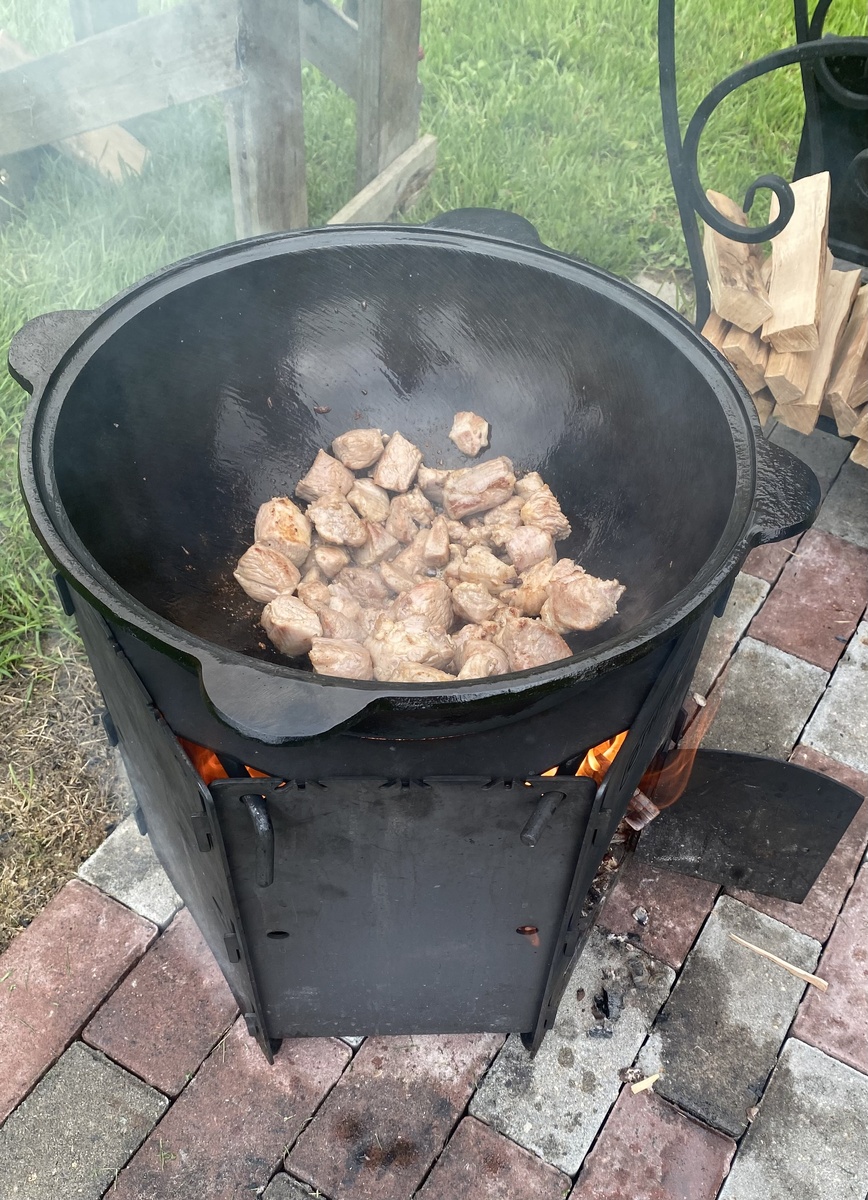 Оджахури - вкуснейшее грузинское блюдо, в основе которого жареная картошка с мясом. Готовится оджахури очень быстро и просто. Это блюдо не оставит вас равнодушными. Специи и аромат костра придадут неповторимый вкус. Ингредиенты: 🥩 Свинина - 1,5 кг 🥔 Картошка - 2 кг 🧅 Лук крупный - 2-3 шт 🫑 Болгарский перец крупный - 3-4 шт 🌿 Петрушка - 1/2 пучка 🧄 Чеснок - 8 зубчиков 🔸Растительное масло 🧂 Соль - по вкусу 🔸Перец черный молотый - по вкусу 🔸 Учхо-сунели - по вкусу 🔸Базилик - по вкусу 🔸Кориандр - по вкусу 🔸Сладкая паприка - по вкусу Приготовление: 1) Мясо ополосните и обсушите бумажными салфетками, чтобы убрать излишки воды. Нарежьте свинину небольшими кусочками одинакового размера. 2) Картофель очистите и порежьте крупными дольками. 3) Перцы помыть, почистить и нарезать соломкой. 4) Лук очистить и нарезать соломкой. Чеснок почистить. 5) Разожгите костёр, установите казан. Влейте растительное масло и хорошо разогрейте его. При помощи шумовки обдайте края казана ра