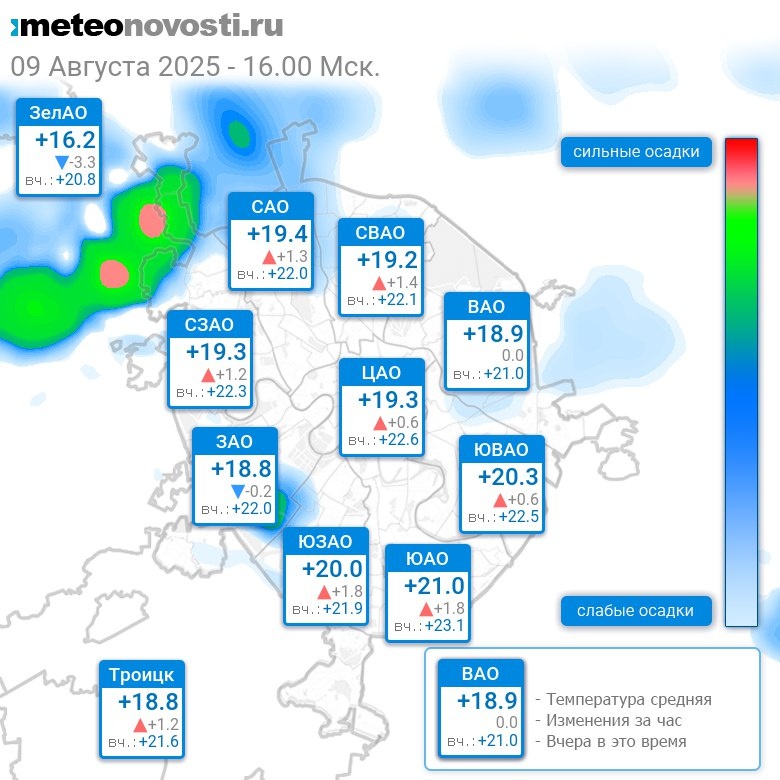В 16:00 в Москве было от +16°C до +22.1°C, средняя температура +19.5°C #погода #Москва #лето #температура #9августа #суббота Перейти на сайт Прогноз погоды на 14 дней