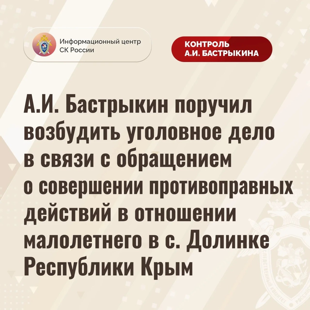Председатель Следственного комитета России Александр Бастрыкин поручил возбудить уголовное дело в связи с обращением жительницы крымского села Долинки. Женщина сообщила о совершении противоправных действий в отношении ее 11-летнего сына, - передает КерчьФМ