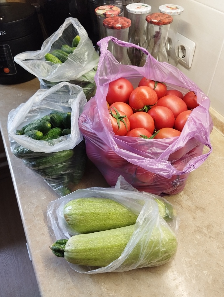 Так сложилось, что суп харчо я не пробовала ни разу. Возможно, когда-то в дешевых столовых я ела что-то из риса с куриными костями, но это явно было не оно. Глядя, как другие рассказывают, как его готовят, и какой этот суп вкусный, я решила попробовать. Немного скорректировала рецепт под нас, не стала класть орехи и петрушку. Острый перец положила в виде порошка, а не свежий, просто его не было. У меня получилось три баночки по пол-литра. Привезла сегодня с рынка огурцы, помидоры и кабачки. Все такое свежее, плотненькое и красивое. Сок из помидоров решила пока не делать, решила попробовать сделать заготовку для супа. Еще я заранее купила сливы и кинзу. Чеснок, лук и специи у меня всегда есть дома. Состав: 2.5кг помидоры 250гр слива 0.5кг лук 100гр чеснок 50гр кинза 0.3чл острый красный перец 1чл хмели-сунели 0.3чл черный молотый перец 3шт душистый перец 1шт лавровый лист 2ст л сахар 1ст л соль 3ст л уксус 9% растительное масло Сначала я вытащила косточки из сливы и прогрела ее в СВЧ, ч