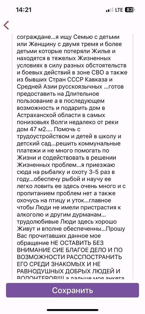 Дорогие сайтяне! Ко мне обратился мужчина со странной просьбой. Вы видите скрин его письма. Если в двух словах, то нужна НЕ пьющая и не употребляющая семья для проживания и ухода за домом в Астраханской области. Можно просто женщина с детьми. Он купит кур и корову. От семьи только порядочность, хозяйственность и доброта. От хозяина проживание, материальная помощь, да принимать его, когда он приезжает на рыбалку из Москвы 4-5 раз в году. Если кого-то заинтересовало предложение или есть кому предложить, кто попал в трудные условия, то напишите мне в личные сообщения и я дам контакт Саши. @natashaross7