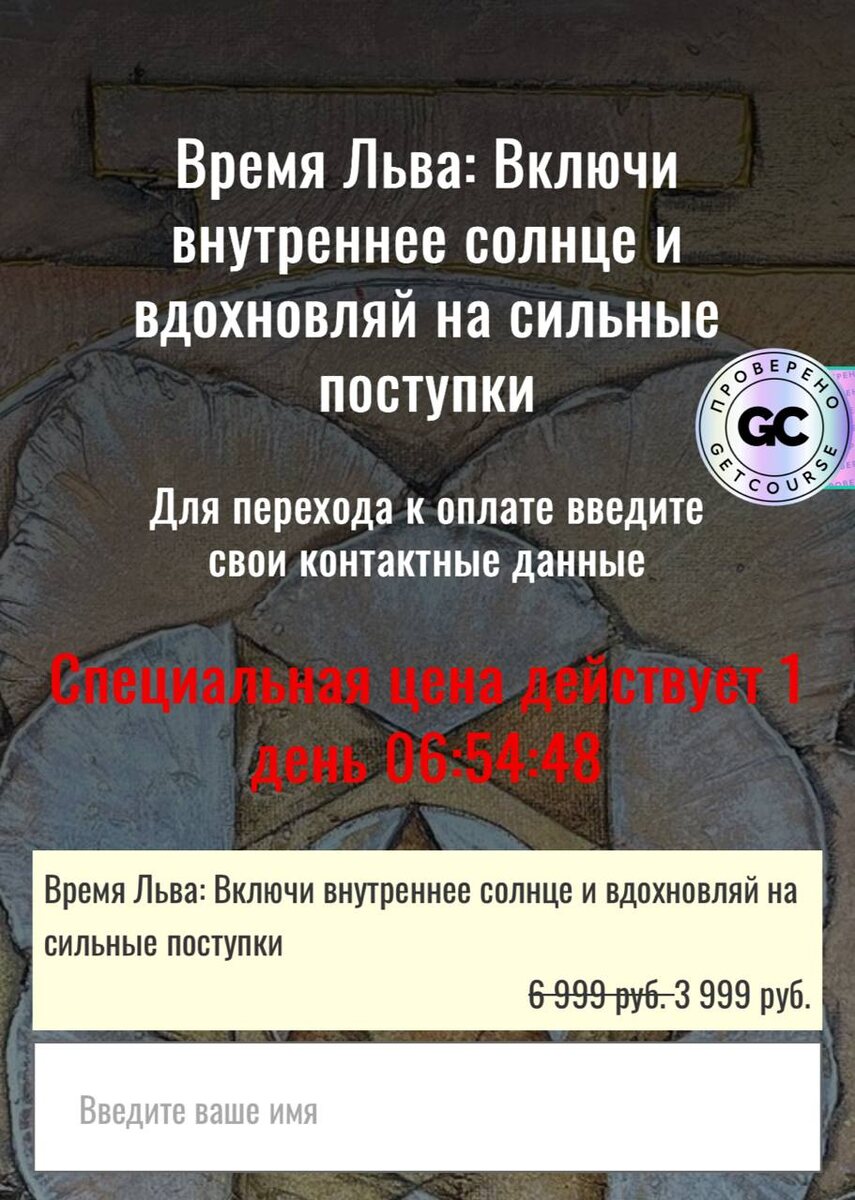 ☀️ Сегодня — ваш последний шанс! ☀️ Урок «Время Льва: Включите внутреннее солнце и вдохновляйте на сильные поступки» 🔥 Стоимость сегодня — 3999₽ Это время для тех, кто готов сиять, действовать и вести за собой. Лев — знак силы, харизмы и внутреннего лидерства. В этом уроке вы раскроете своё внутреннее солнце и наполнитесь энергией, которая притягивает успех и внимание. Вас ждёт: 1️⃣ Урок по янтре Солнца — активация жизненной силы и энергии изобилия 2️⃣ Урок по знаку зодиака Лев — глубокое понимание и применение его силы в вашей жизни 3️⃣ Практики для уверенности, харизмы и внутреннего лидерства 4️⃣ Гайд с пошаговыми рекомендациями, чтобы ваш внутренний свет сиял всегда 💛 Это не просто урок — это ключ к состоянию, когда вы чётко знаете, кто вы, куда идёте и как вдохновлять других своим примером. ⏳ Сегодня — особая цена 3999₽. Уже завтра она изменится. 👉 Переходите по ссылке и войдите во Время Льва с сиянием в душе и силой в сердце! УРОК