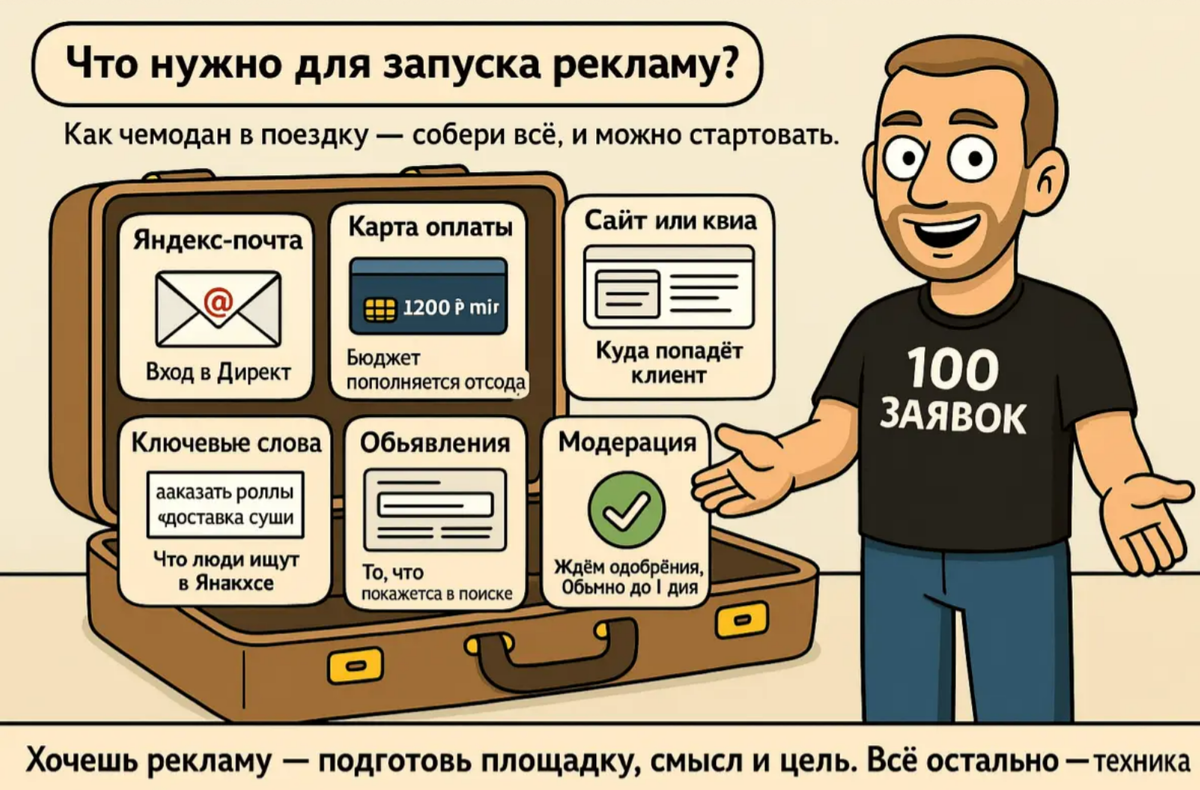 Что вообще нужно подготовить, чтобы реклама реально пошла и начала работать. Здесь без воды. Я покажу тебе что по шагам нужно, как будто ты собираешь чемодан перед поездкой. 📦 1. Нужен Яндекс-аккаунт