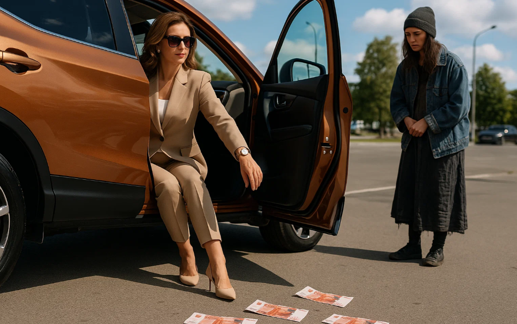 Бездомная Вера пересчитывала мелочь у витрины, когда увидела — из сумочки женщины возле белого кроссовера выпала пачка купюр. Прямо под колеса.