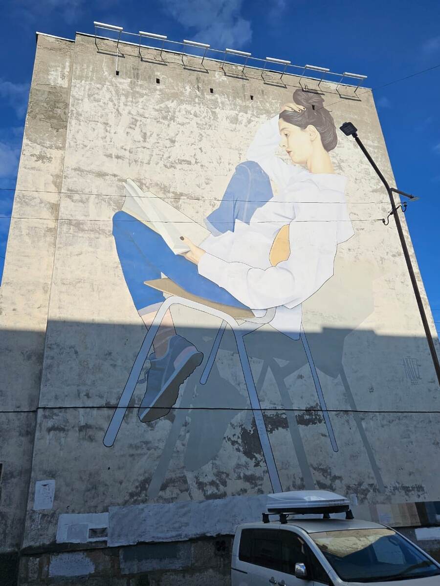 На одной стене изображены отдыхающие в порту люди, которые застряли в бетонных текстурах, на другой — плывущие в море люди, а на третьей текст, созданный нейросетью.