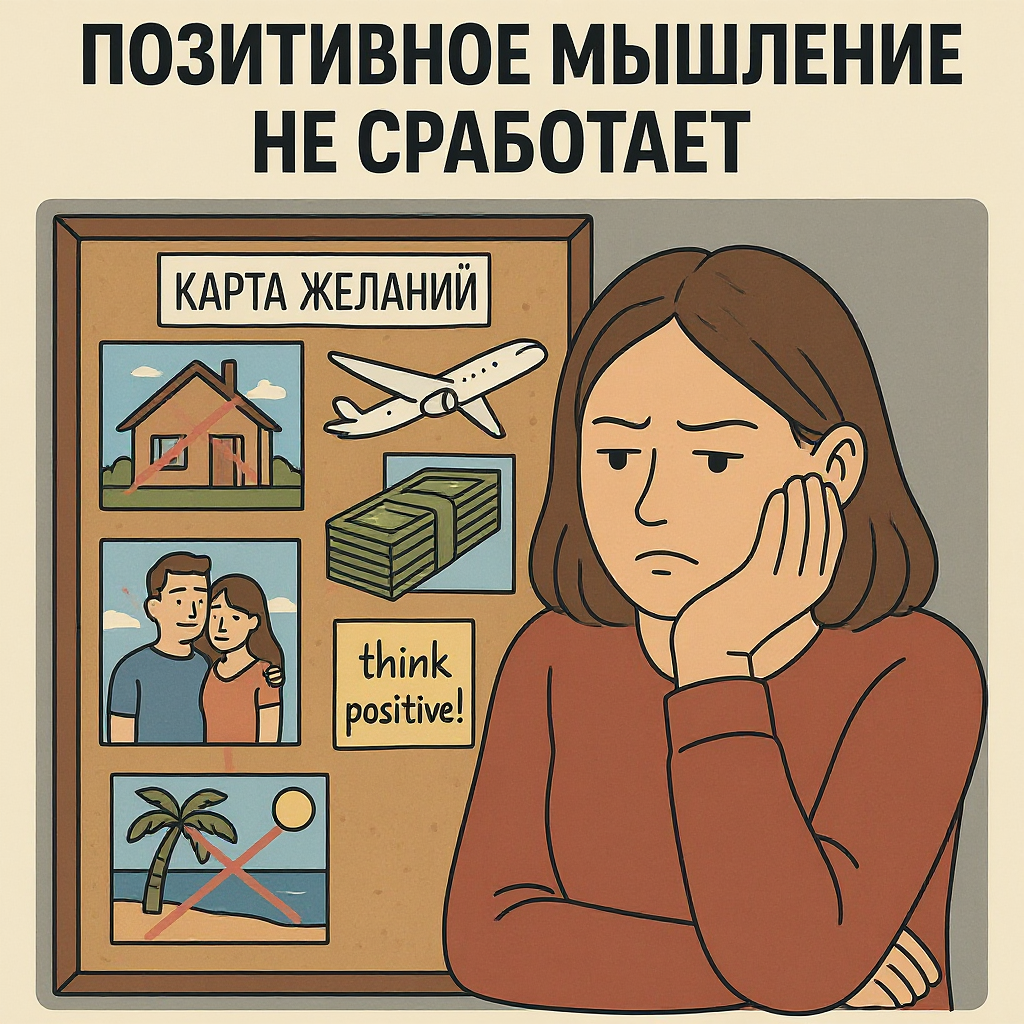 В мире саморазвития последние десятилетия царит культ позитивного мышления. Нас учат, что стоит лишь правильно сформулировать желание, наклеить картинку на «Карту желаний» и поверить в успех — и Вселенная тут же положит к вашим ногам новенький автомобиль, идеального партнера и виллу у моря. Книги вроде «Секрет» и марафоны желаний обещают простую формулу счастья: «Думай — и получишь».