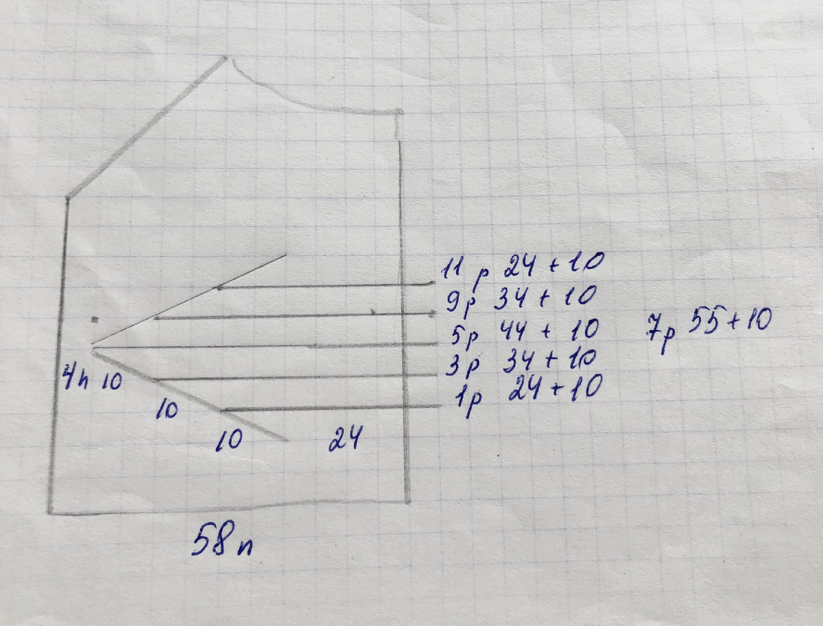 Всем доброе утро! Сегодня хочу рассказать , как я считаю и вывязываю вытачки , при вязании изделия от горловины . Кто-то считает это лишним занятием и пустой тратой времени , но если вы - представительница лучшей половины человечества с прекрасным верхом и не хотите , чтобы полочки «взлетели вверх» , без вытачек не обойтись Длина вытачки Расстояние между выступающими точками грудных желёз делим на два и прибавляем 2-3 см Расчеты для моей кофточки : (20:2)+3=13 см Полученную величину вычитаю из ширины полочки и перевожу см в петли 27,5-13=14,5 см 14,5*2,07=30 петель Глубина вытачки Определяю по размеру бюстгальтера 4 размер = 4 см 4 *3 = 12 см Все данные записываю Навешиваю маркеры и начинаю вязать 1 ряд : провязываю 34 петли ( из них 10 вытачки ) и поворачиваю работу на изнаночную сторону Укороченные и удлиненные ряды вяжу «немецким» способом 2 ряд : 33 изнаночные петли 3 ряд : 44 петли ; поворачиваю работу на изнаночную сторону 4 ряд : 43 изнаночные петли 5 ряд : 54