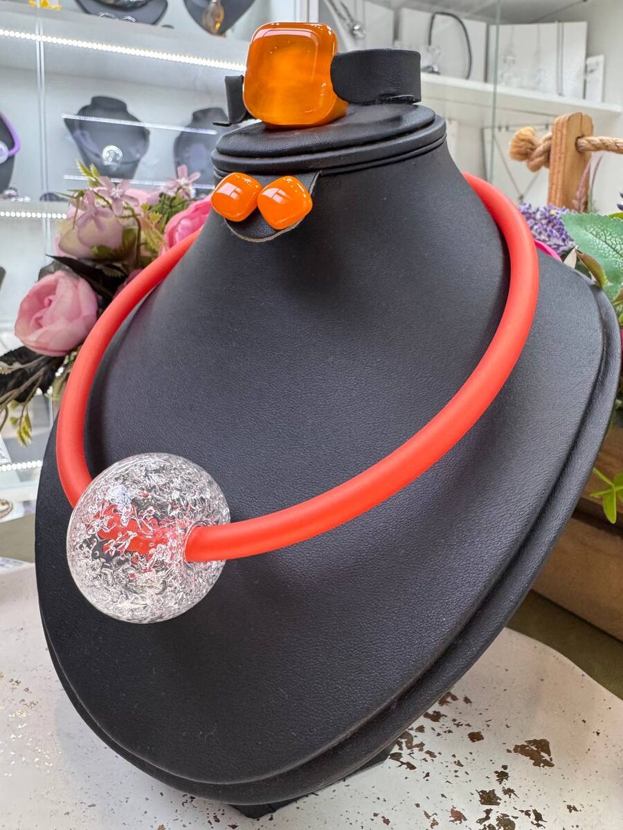 Каучук - гипоаллергенный материал, который прослужит очень долго. А яркий оранжевый цвет этого каучукового колье в сочетании с прозрачным шаром создаёт гармоничный и очень эффектный дуэт. 💎 Колье 3800-15%=3.230 Пусты 1200-15%=1 020 Кольцо 4200-15%=3.570 ✨Нажмите для заказа ✉️ Нажмите чтобы задать вопрос