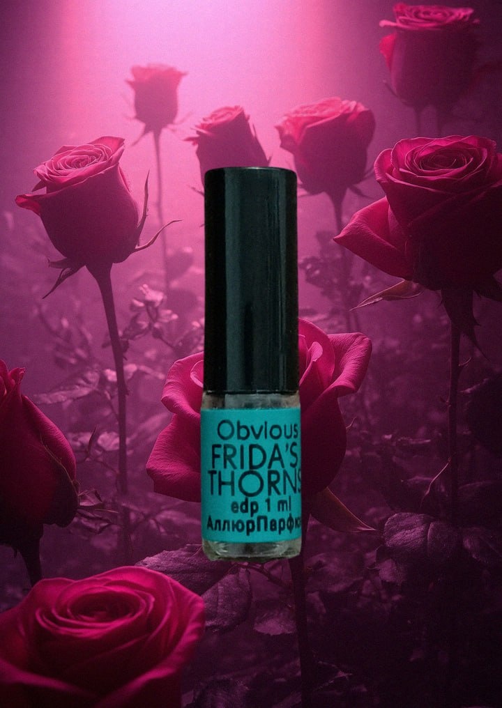 "Frida's Thorns" ("Шипы Фриды"), посвященный гениальной мексиканской художнице Фриде Кало, передает ее страстный нрав сквозь необычное сочетание темно-красной розы, сладковатой малины и шершаво-специевого какао. С помощью столь неожиданного переплетения оттенков бренд предлагает новый интересный взгляд на парфюмерное прочтение розы: "Роза, наполненная любовью, болью и желанием, не хочет попадать в ловушку привычной роли, на которую ее слишком часто определяют". Аромат получился самобытным, эмоциональным и ярким, как и сама Фрида: https://allureparfum.ru/katalog/zhenskaya-parfyumeriya/obvious/frida-s-thorns.html