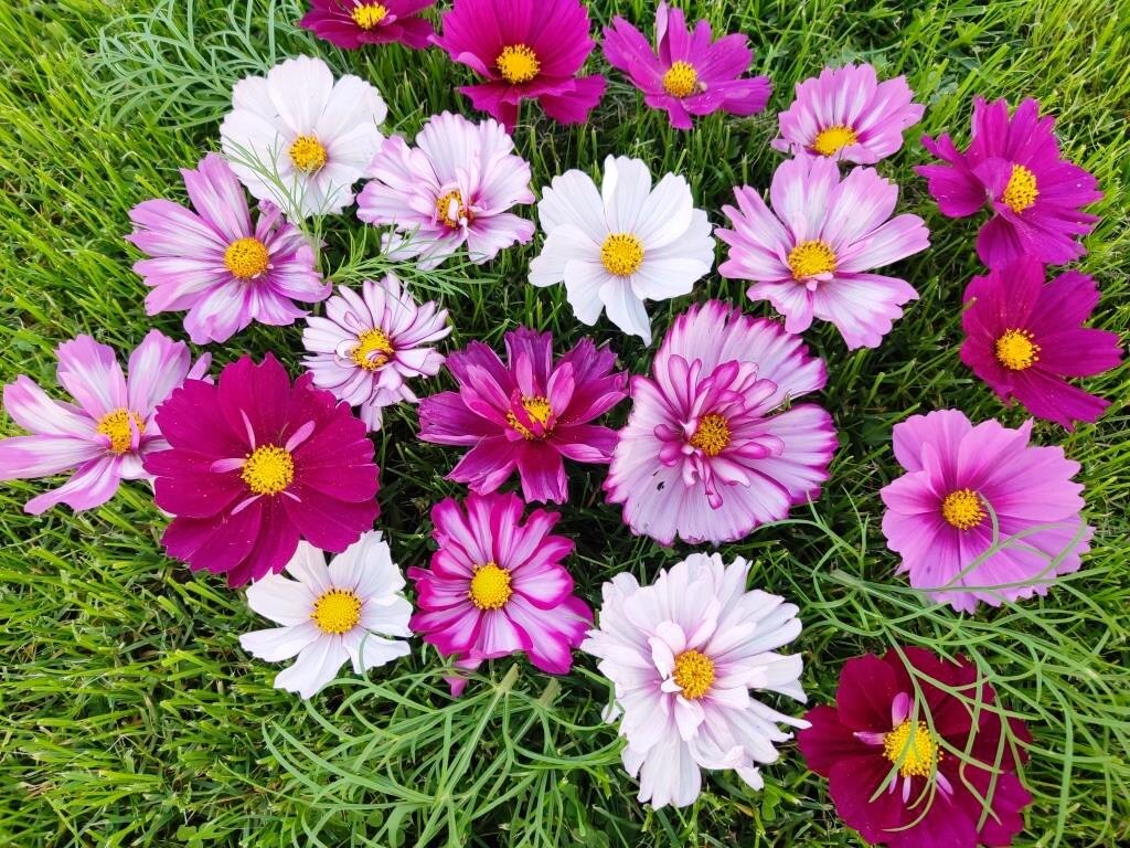 1. Космея полумахровая (смесь окрасок). Зацветает в мае и радует до заморозков. Высокое, но удивительно устойчивое растение, не нуждается в опоре. В смеси представлены различные расцветки.
