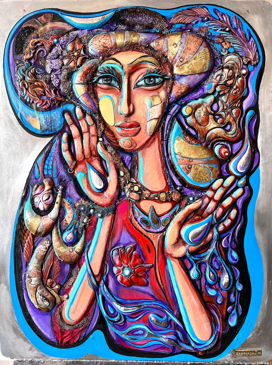 Работа над образом, Агидель, Волга - заняло несколько лет, маленькая капелька, родник, озеро, потом ОКЕАН. На шумерском АК-КИ-АН означает - «не-земля-небо». А маленькая капелька зимой превращается в белоснежную снежинку, а летом в облачко и все они живут на небесах, а в дождливую погоду на небесах появляется радуга. Женщина! Женское начало Божества. Вывод напрашивается сам собою: женщина - Божье лицо, обращённое к свету дня, к этому миру. Поэтому архаический образ Великой Матери равно свят и достоин поклонения.