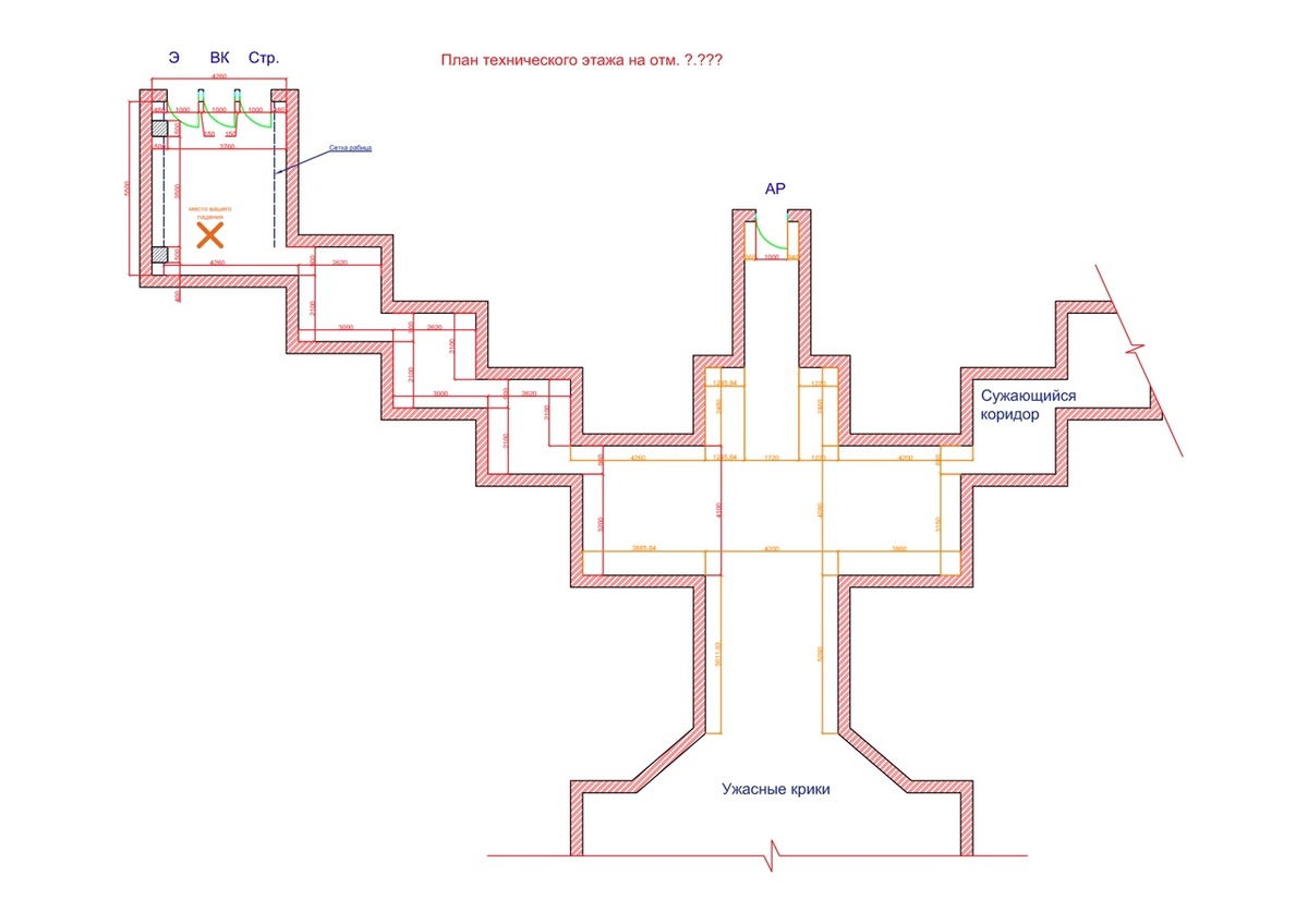 Продолжение поста: https://vk.com/wall-138457212_64682 Растаскивая куски строительного мусора, арматуры и пролезая в темноте через поеденную коррозией перегородку, вы, все же, умудряетесь пораниться на -20 hp, с учетом заклеенной задницы после падения. Сейчас ваше самочувствие на 70 hp. Засунув телефон с фонарем в нагрудный карман рубашки, вы на ощупь мерили каждое последующее помещение. Ориентируясь по планам этажей выше, откуда упали, вы спокойно определяете ориентацию вырисовывающейся планировки. Вы заметили, что из всех инженерных коммуникаций, вы не видели только вентиляцию. Ни шахт, ни воздуховодов, и даже общеобменных и местных систем, не наблюдалось. От этих мыслей вам стало еще душнее…. Дойдя до развилки, вы осматриваетесь: -Впереди восточный блок, выглядит так, будто вас ожидают зеркальные западной стороне помещения, откуда вы пришли (возможно там тоже 3 двери) -На юге, справа, помещения расширяются, и за тьмой не видно ничего, она будто витает в воздухе, и свет от фонаря