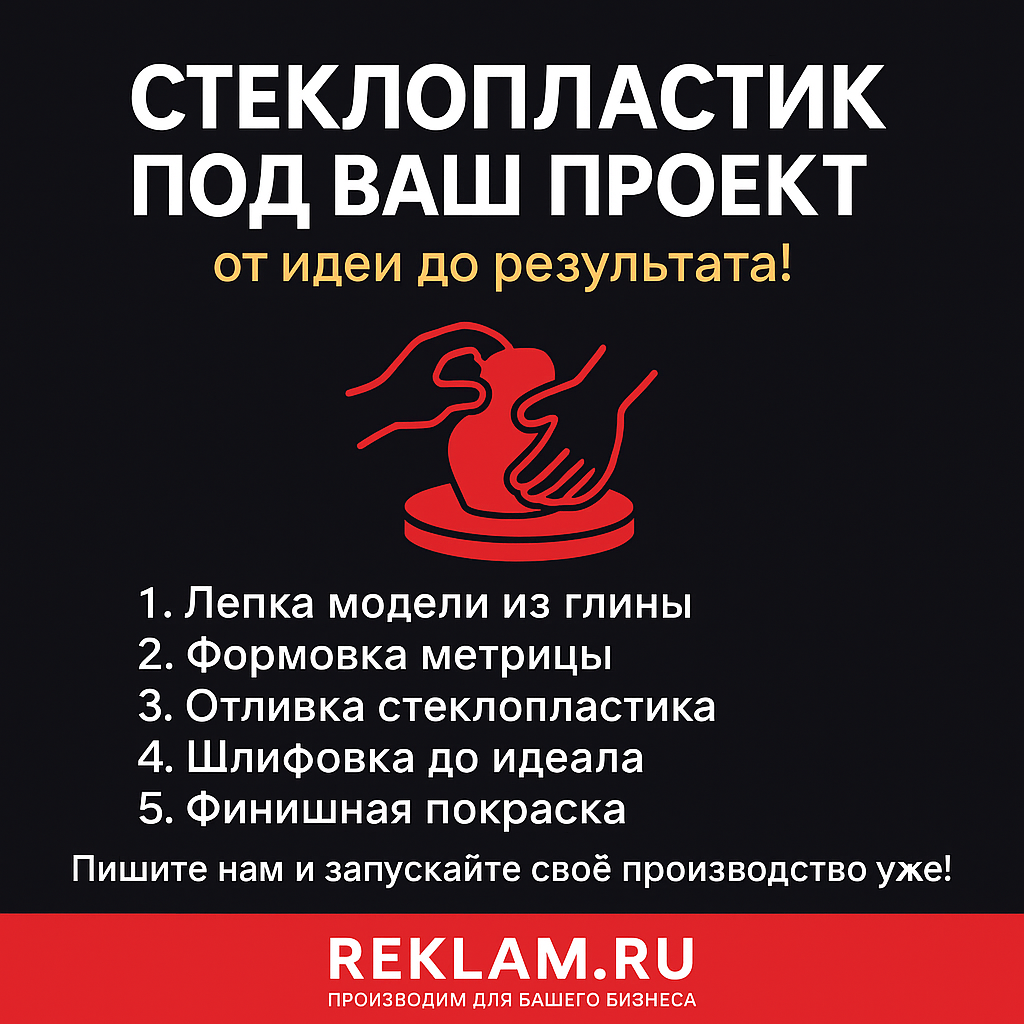 Современные технологии производства из стеклопластика (fiberglass) позволяют создавать прочные, долговечные и эстетичные изделия, которые идеально подходят для бизнеса в самых разных отраслях — от наружной рекламы и декора до промышленного оборудования и нестандартных конструкций. В REKLAM.RU мы реализуем полный цикл работ — от первой идеи до готового изделия, полностью соответствующего вашему техническому заданию. Стеклопластик сочетает в себе преимущества металла и пластика: Именно поэтому его активно используют для архитектурных элементов, вывесок, фигур, корпусов оборудования, уличной мебели, выставочных объектов и малых архитектурных форм. Всё начинается с создания оригинальной формы. Наши мастера вручную лепят прототип из пластилина или глины, отрабатывая каждую деталь.