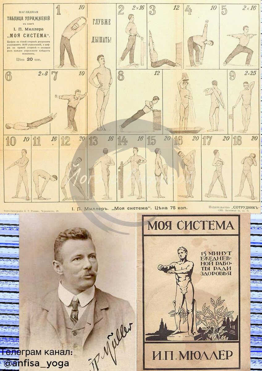 А вы знаете что? 🏛 Гимнастика Мюллера — «скандинавская йога» начала XX века В начале XX века, когда слово «фитнес» ещё не существовало, а утренняя зарядка только входила в привычку, по всей Европе и в Российской империи распространилась мода на необычную систему оздоровления — гимнастику Мюллера. Её автор — Йорген Петер Мюллер (Jørgen Peter Müller, 1866–1938), датский спортсмен и бывший офицер, который в 1904 году издал книгу «Моя система» (Mit System). В ней он предложил несколько простых упражнений для ежедневного выполнения, не требующих снарядов или специального зала. Мюллер был уверен: 15 минут в день достаточно, чтобы поддерживать тело в силе, гибкости и здоровье. Главное — делать это ежедневно, с дыханием и вниманием к ощущениям. 📅 История и годы популярности в России 1904 — книга вышла в Копенгагене и быстро стала европейским бестселлером. 1905–1906 — «Моя система» переведена на английский, немецкий, французский и русский. 1907 — в Петербурге и Москве открываются пер