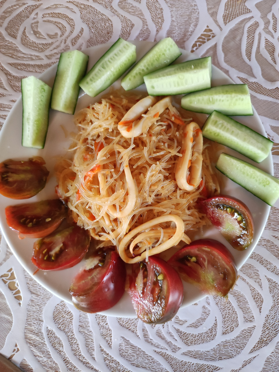 кальмары слегка минуту полторы ещё потушила и добавила фунчозу,