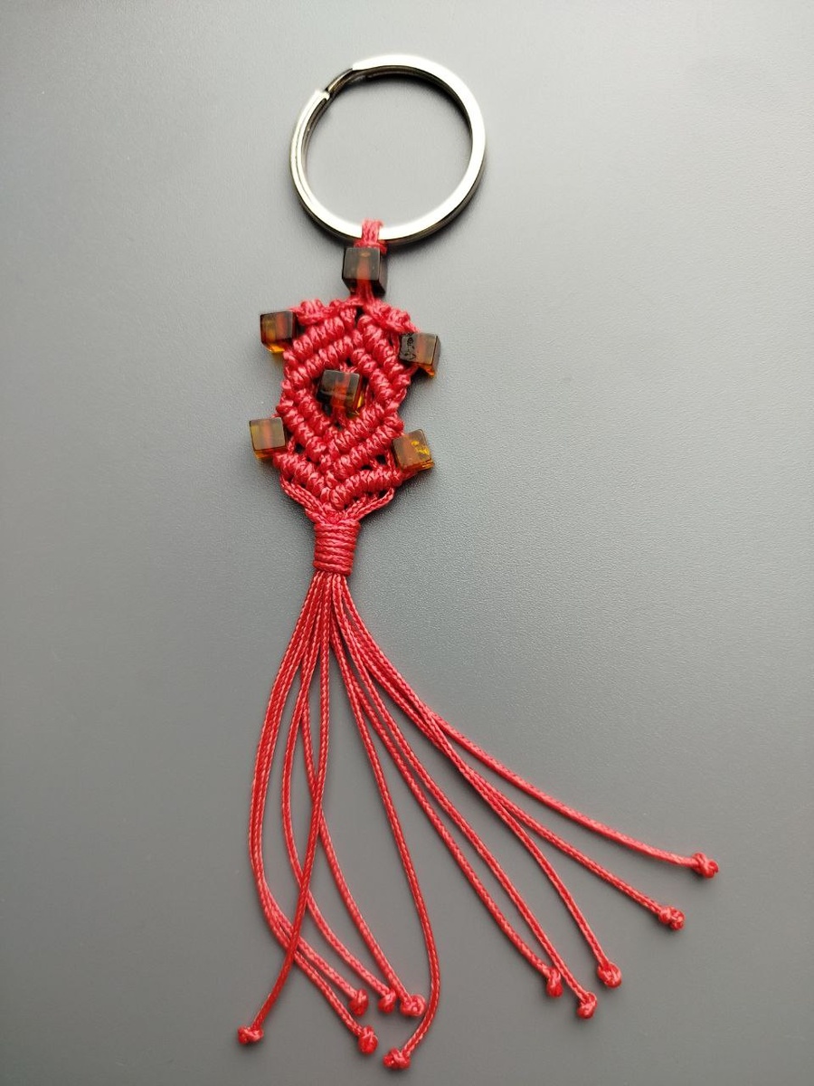 Продолжая тему макраме, хочу показать вам мастер-класс по созданию брелка для ключей в технике макраме. Это один из простых вариантов плетения с использованием репсового узла. Но, обо все поподробнее! Для работы нам нужен будет шнур, основа для брелка и бусины с крупным отверстием. Отмеряем 5 шнуров длиной 80-90 см. и складываем их пополам. Мне не очень понравилось работать в данном случае с синтетическим шнуром из полиэстра. Работать с хлопковым шнуром было бы удобнее. В следующий раз возьму хб. Один шнур, сложенный вдвое фиксирую на металлическом колечке. Затягиваю, сразу на две нити нанизываю бусину. Нити развожу в стороны. Аналогичным способом, как с колечком, на боковые нити фиксирую оставшиеся 4 шнура, по 2 с каждой стороны. А затем нанизываю бусины по бокам на основные нити. У нас 5 нитей слева и 5 справа. Работаем пока с нитями слева. Крайнюю правую кладем поверх остальных и начинаем плести репсовый узел. Узел не сложный. Одна нить основная остальные рабочие. Одной рабочей ни