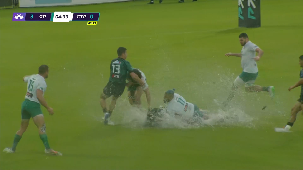 Сегодня в центральном матче 9-го тура PARI чемпионата России по регби – «Красный Яр» дома обыграл «Стрелу-Ак Барс» (13:8). Спортс’’ показывал игру в прямом эфире прямо здесь (комментаторы – Алексей Попов и Антон Хализов): ● Красноярск не порадовал погодой – дождь лил с утра и превратил поле в болото. Не прекратился дождь и к началу матча – пришлось стартовать под ливнем и с большими лужами на газоне. Вода хлестала из под ног регбистов, игра трансформировалась в новый вид – водное регби. «Красный Яр» открыл счет на третьей минуте – реализовал штрафной. Тут же казанцы нарушили еще раз и схватили желтую карточку. Красноярск быстро воспользовался большинством – Буркуталы Тойчуев занес попытку. Больше «Стрела» осечек не допустила, дождалась возвращения игрока и тоже ответила попыткой от Давудова. А «Яр» по такой погоде решил не рисковать и пробивать по воротам все штрафные. Сначала Таумалоло попытался набраться три очка с центра поля – мяч летел в ворота, но попал в центральную перекладину!