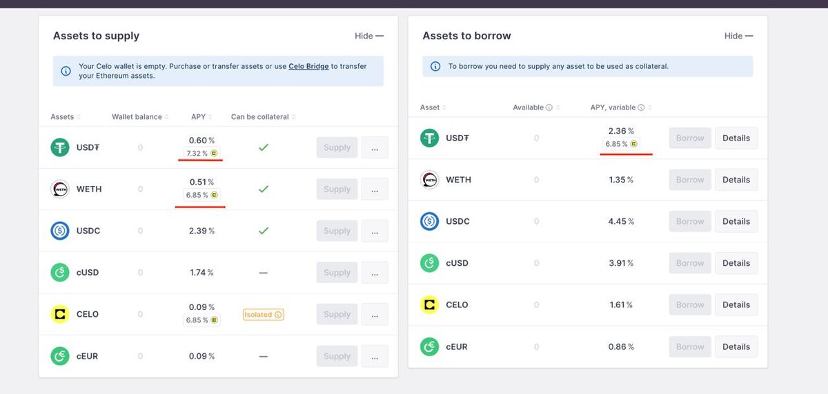 На AAVE в сети CELO накидывают награды в токенах CELO за депозит и займ, можно условно положить эфирчик, взять займ в USDT и вам еще будут доплачивать 🤑