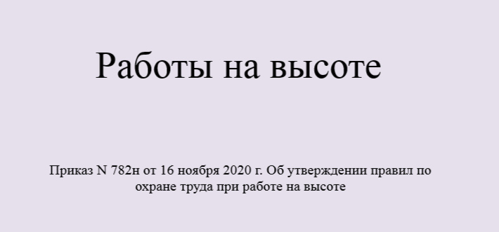 Приказ N 782н от 16 ноября 2020 г. Об утверждении правил по охране труда при работе на высоте. Работы на высоте организовываются в 4 этапа: 1. оформляется пакет документов; 2. к работе допускаются сотрудники, у которых есть документ о профобразовании; 3. сотрудники направляются на обучение в образовательную организацию; 4. проводится контроль применения работниками систем безопасности и СИЗ. К работам на высоте относятся работы, при которых есть риск падения с высоты 1,8 м, а также работы на меньшей высоте, если они проводятся: − над машинами или механизмами, например над транспортными средствами, станками, конвейерами и т. д.; − над поверхностью жидкости или сыпучих мелкодисперсных материалов, например над водой, песком, строительным мелом и т. д.; − над выступающими предметами, например над лестницами, мебелью, трубопроводами и т. д.; Подъем или спуск по стационарной лестнице относится к работе на высоте, при условии, что высота превышает 5 м и угол наклона лестницы – больше 75 г