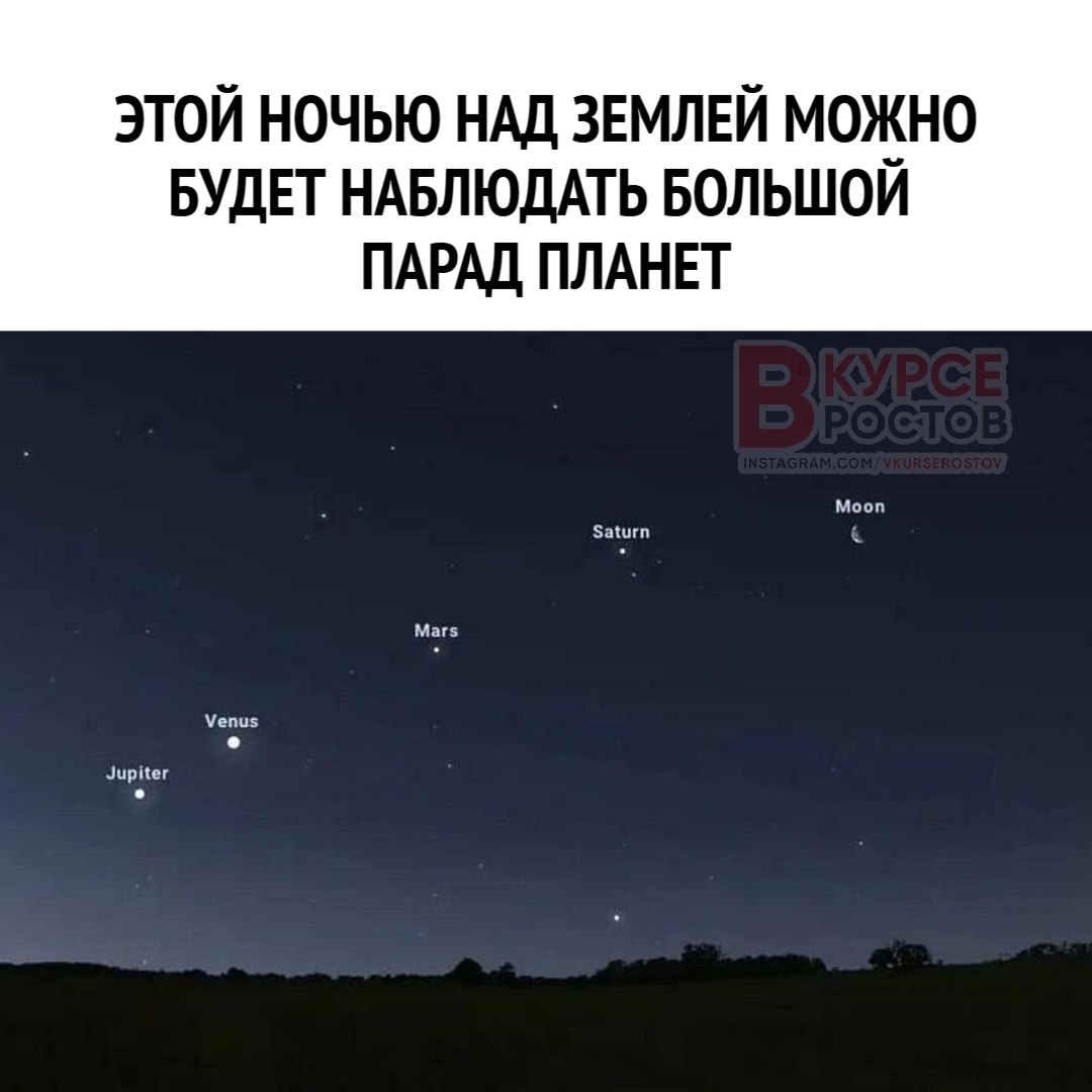 🪐Этой ночью над Землей можно будет наблюдать большой парад планет Меркурий, Юпитер, Венера, Уран, Нептун и Сатурн выстроятся в одну линию. Новости Ростова здесь 👉 @vkurserostov